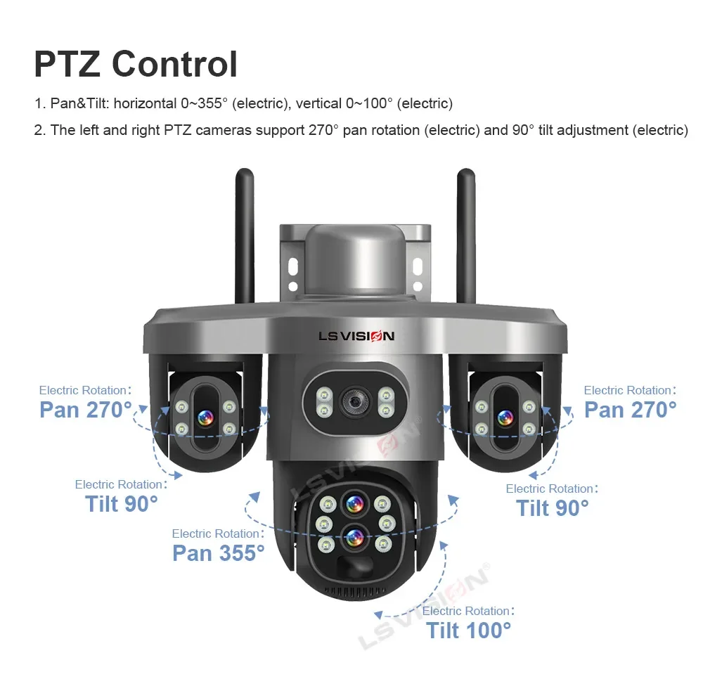กล้อง LS VISION 20MP ซูมออปติคอล 10 เท่า เลนส์ PTZ สามตัว กล้องโซลาร์กลางแจ้ง WiFi/4G จอภาพสามจอ ติดตามอัตโนมัติ กล้องรักษาความปลอดภัย V380 Pro