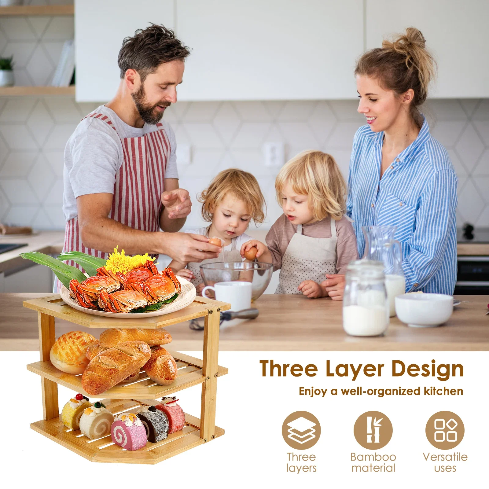 ชั้นวางของในตู้ 3 ชั้น สำหรับจัดเก็บในครัว ชั้นวางจานแข็งแรง ชั้นวางมุมไม้ไผ่ ชั้นวางจานสำหรับตู้และเคาน์เตอร์