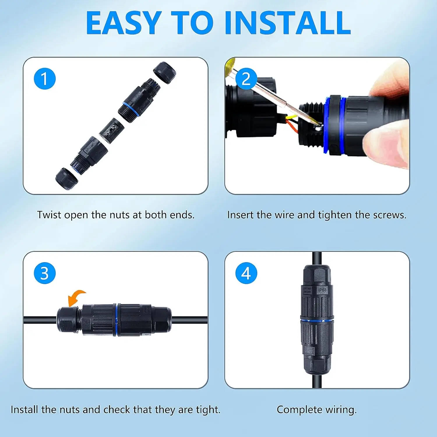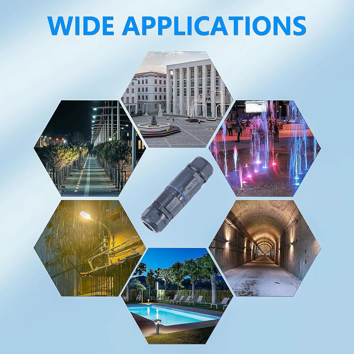 ตัวเชื่อมต่อใช้กันอย่างแพร่หลายใน: ไฟถนนแนวนอน, ไฟแนวนอน, ไฟทางเดิน, ไฟภายใน, ไฟดาดฟ้า, สวน, ทางรถวิ่ง, ลาน, ระเบียง, สนามหญ้า, งานใต้น้ํา, พื้นที่การก่อสร้าง, พื้นที่ไซต์, เหมาะสม: สายไฟแรงดันต่ํา, สายไฟภายนอก, สายไฟต่อขยาย govee, กล่องไฟฟ้ากลางแจ้ง