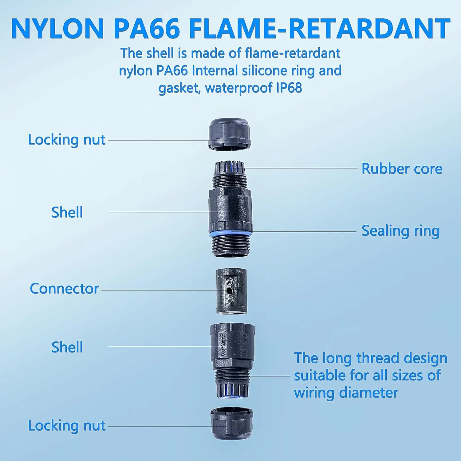 วัสดุเชื่อมต่อไฟฟ้า: ไนลอนทนไฟ PA66 ผิวด้านนอก ชั้นฉนวนทั้งหมดทําจาก PA66 ทนไฟ ทนต่อการกัดกร่อนและทนต่อการสึกหรอ วัสดุสายไฟ: ทองเหลืองชุบนิกเกิล ขั้วต่อแกนทองแดงกันน้ํา