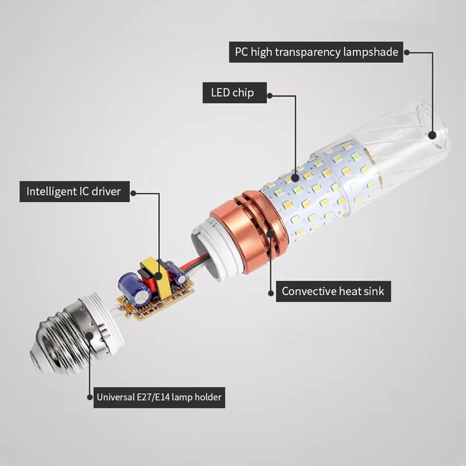 *อุณหภูมิสีต่างๆ: หลอดไฟข้าวโพดบางรุ่นมีฟังก์ชั่นเปลี่ยนสีสามสี เช่น หลอดไฟ LED ข้าวโพดของ Labonta ซึ่งสามารถสลับระหว่างอุณหภูมิสีสามสีได้อย่างง่ายดาย: แสงอุ่นในเวลากลางวันและแสงที่เป็นกลาง
