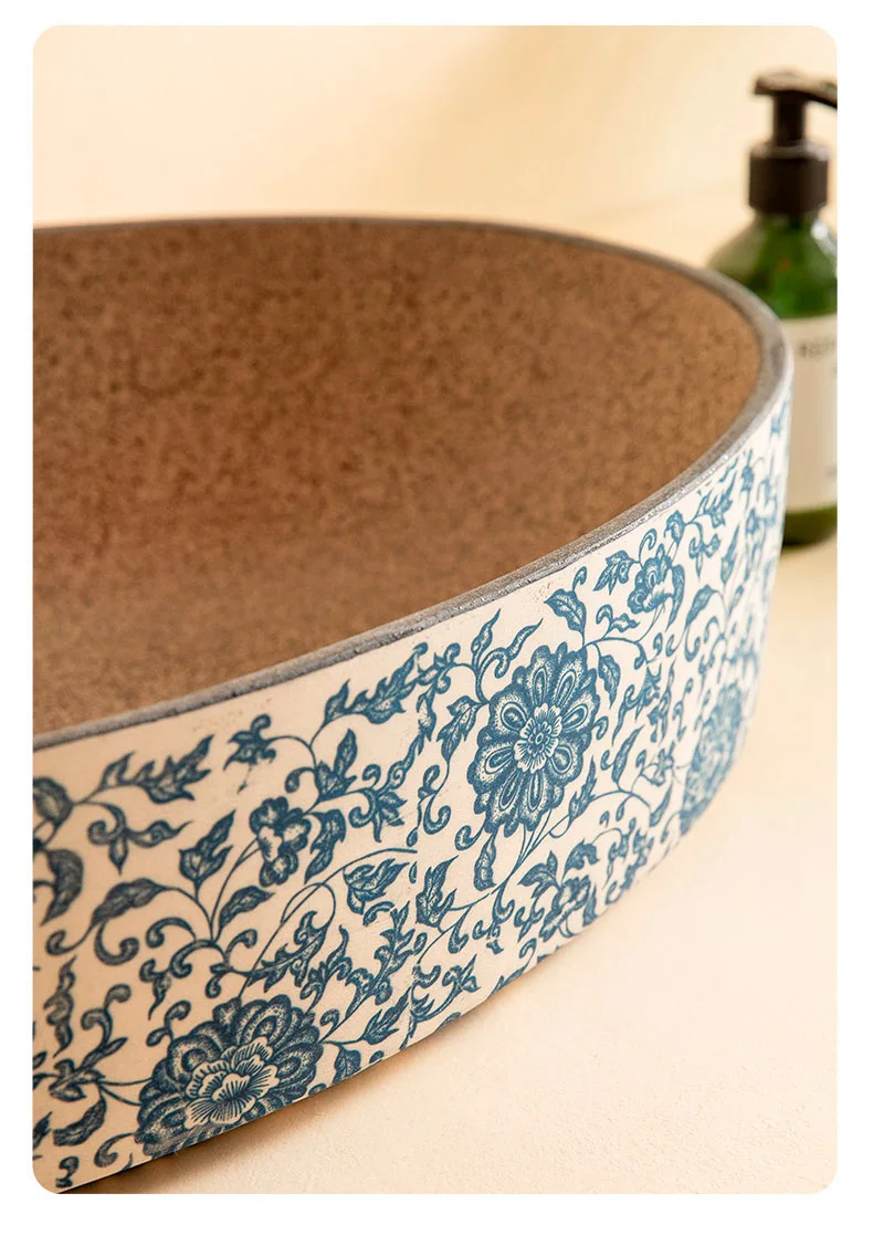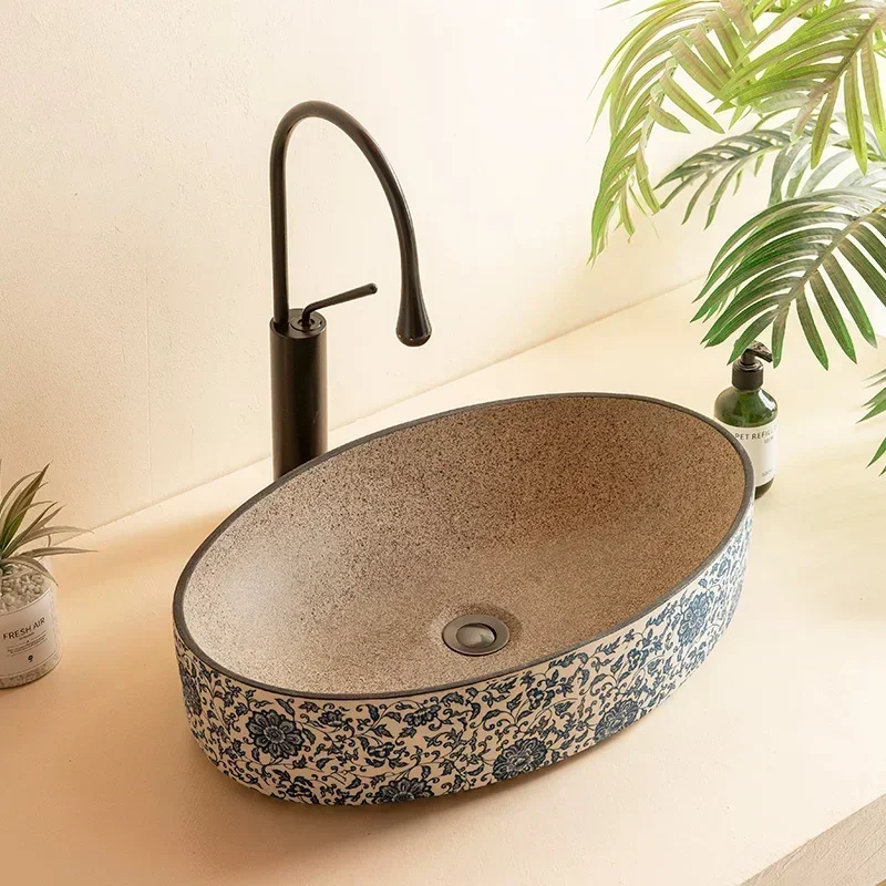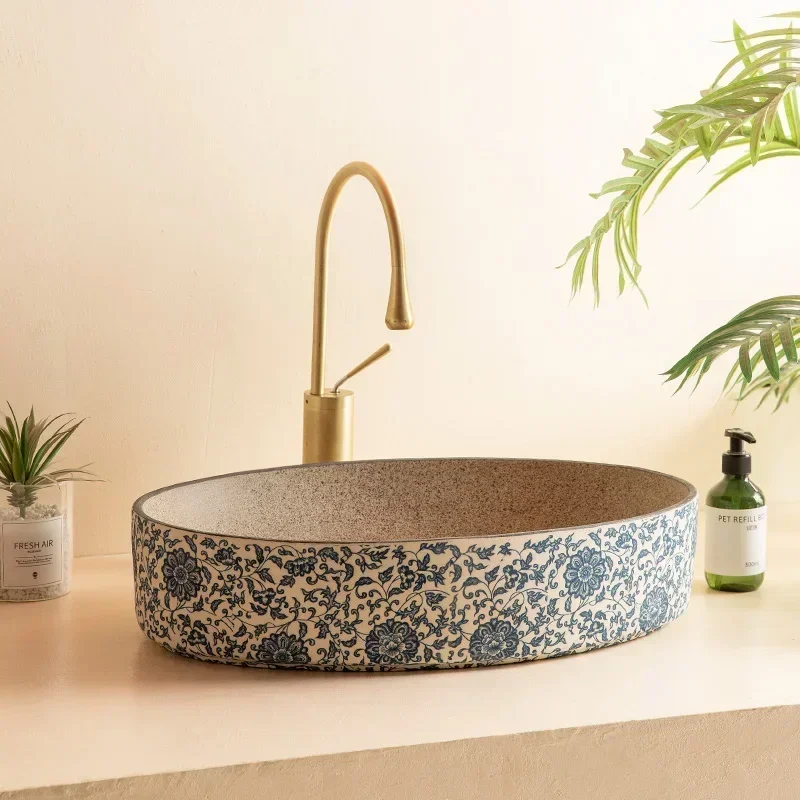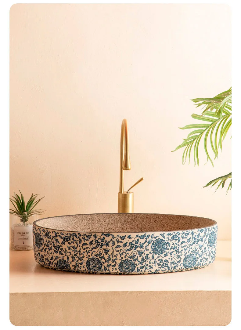 พอร์ซเลนสีฟ้าและสีขาวเซรามิคอ่างล้างหน้ารูปไข่ retro ระเบียงล้างมืออ่างล้างหน้าเดี่ยวห้องน้ําล้างหน้าห้องน้ําอ่างล้างจานอ่างล้างหน้า