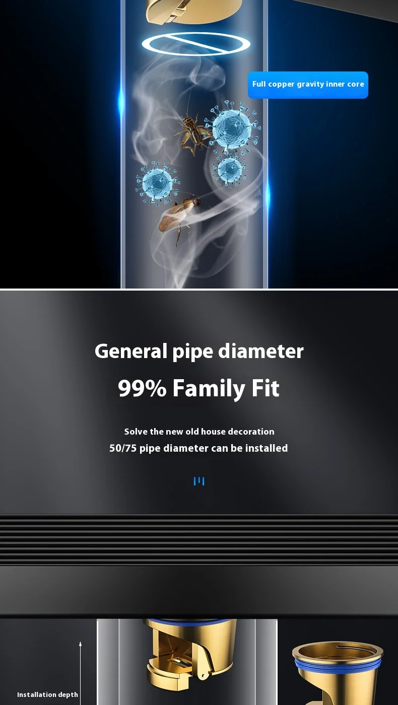 สีดํา 304 สแตนเลสสตีลยาวแถบท่อระบายน้ําห้องน้ําท่อระบายน้ําทองแดง Core Anti-กลิ่นระบายน้ํา 20-100 ซม. จาก 2 รีวิว