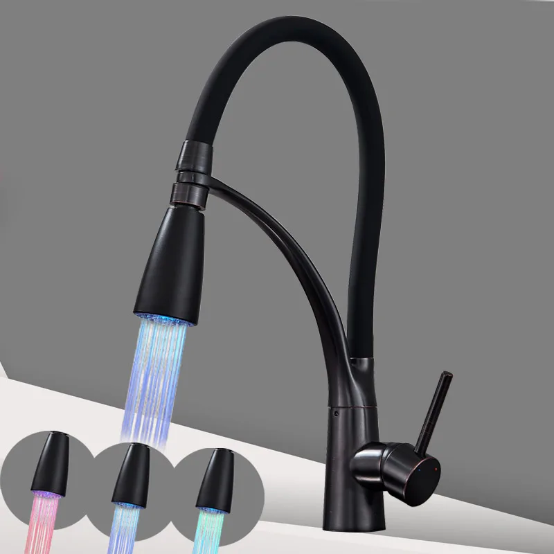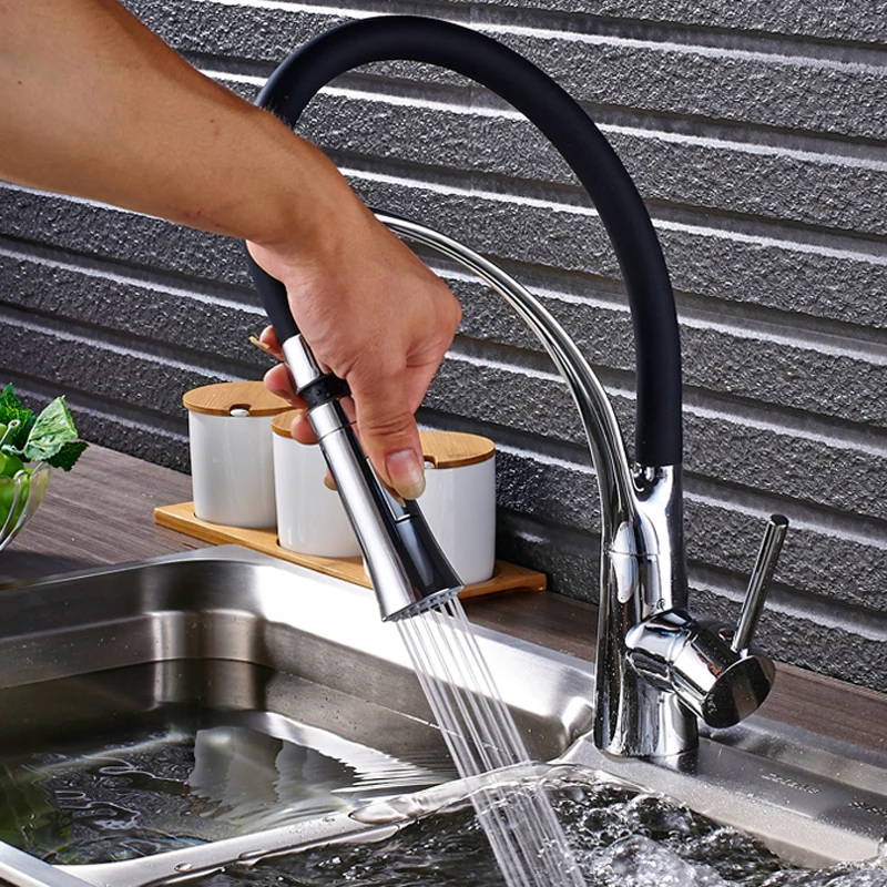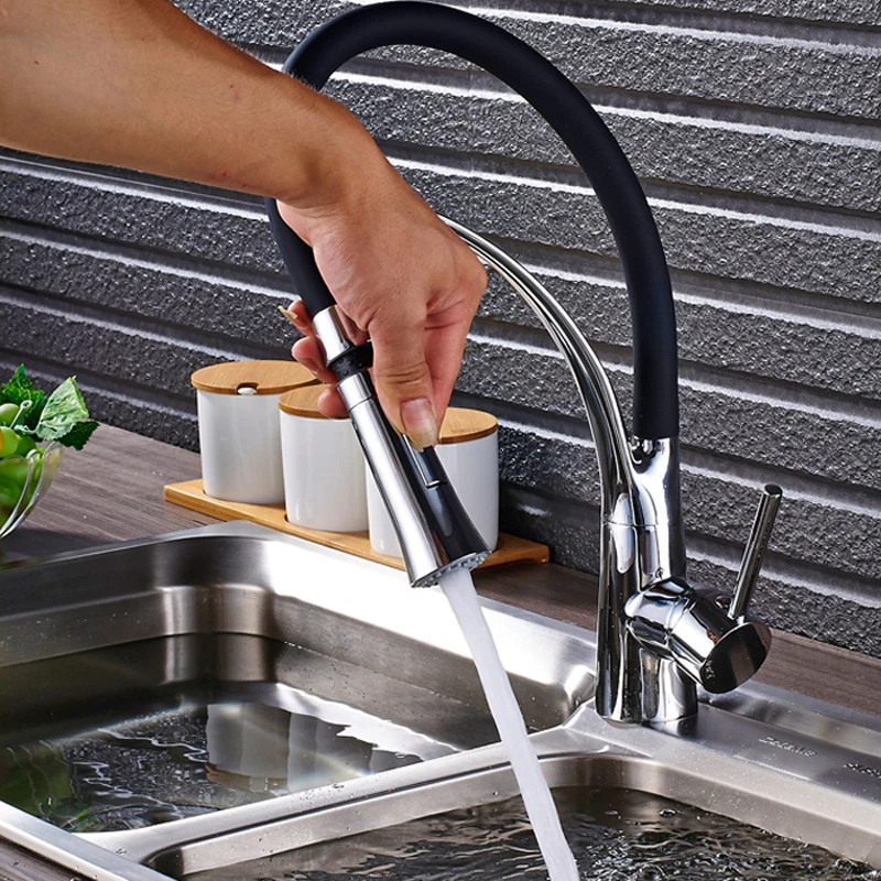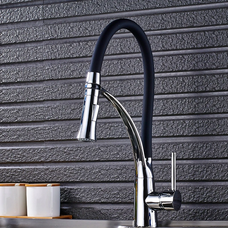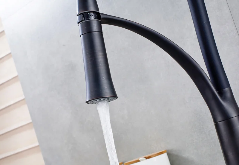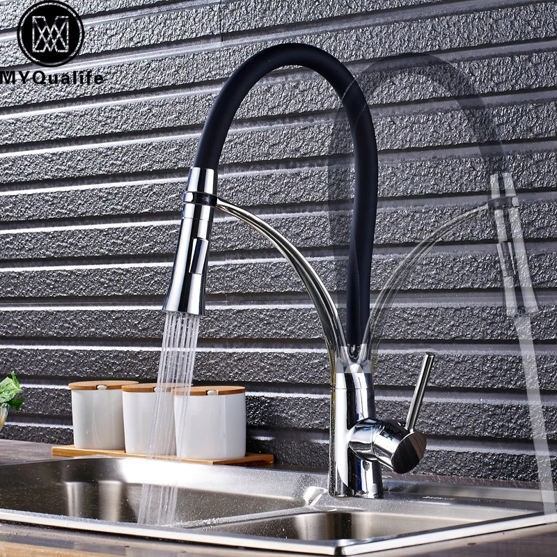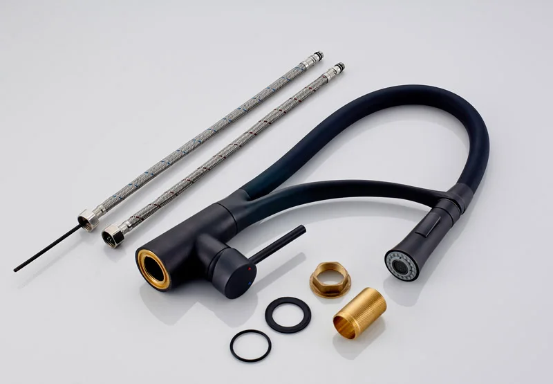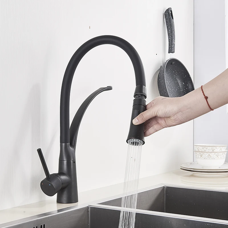 Matteสีดำก๊อกน้ำห้องครัวดึงหมุนอ่างล้างจานTAP Deckติดตั้งห้องน้ำร้อนเย็นผสม