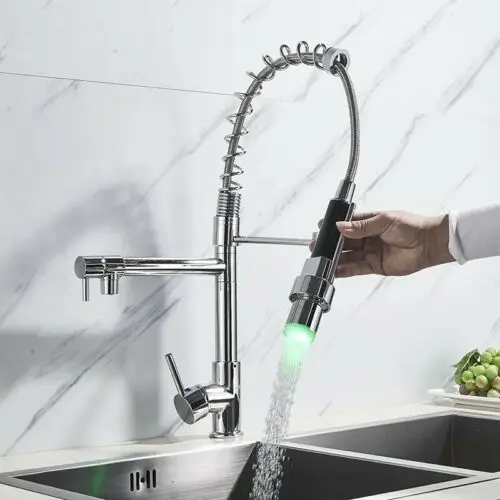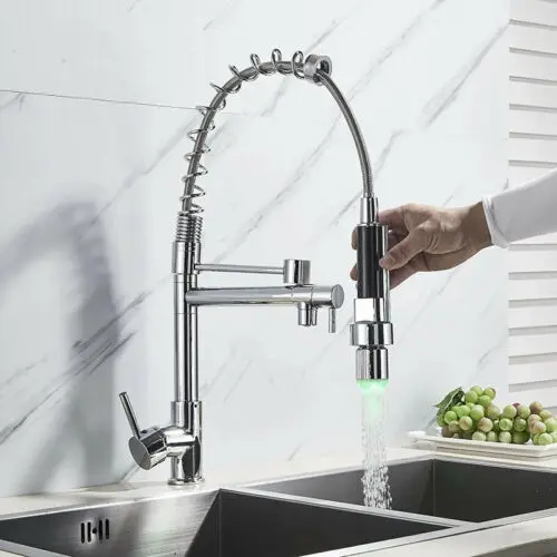 ฤดูใบไม้ผลิ LED ก๊อกน้ําห้องครัว Chrome ดึง Sprayer Dual Spout เดี่ยว TAP ก๊อกน้ําอ่างล้างจาน 360 หมุนก๊อกน้ําห้องครัว