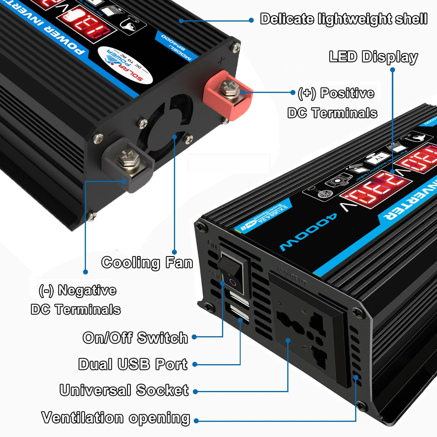 อินเวอร์เตอร์แปลงไฟรถยนต์ 4000W 12V เป็น 220V/110V พร้อมจอ LED แสดงผล ตัวแปลงไฟ ชาร์จเจอร์ อะแดปเตอร์ ป้องกันหลายชั้น พอร์ต USB คู่ แปลงแรงดันไฟฟ้า