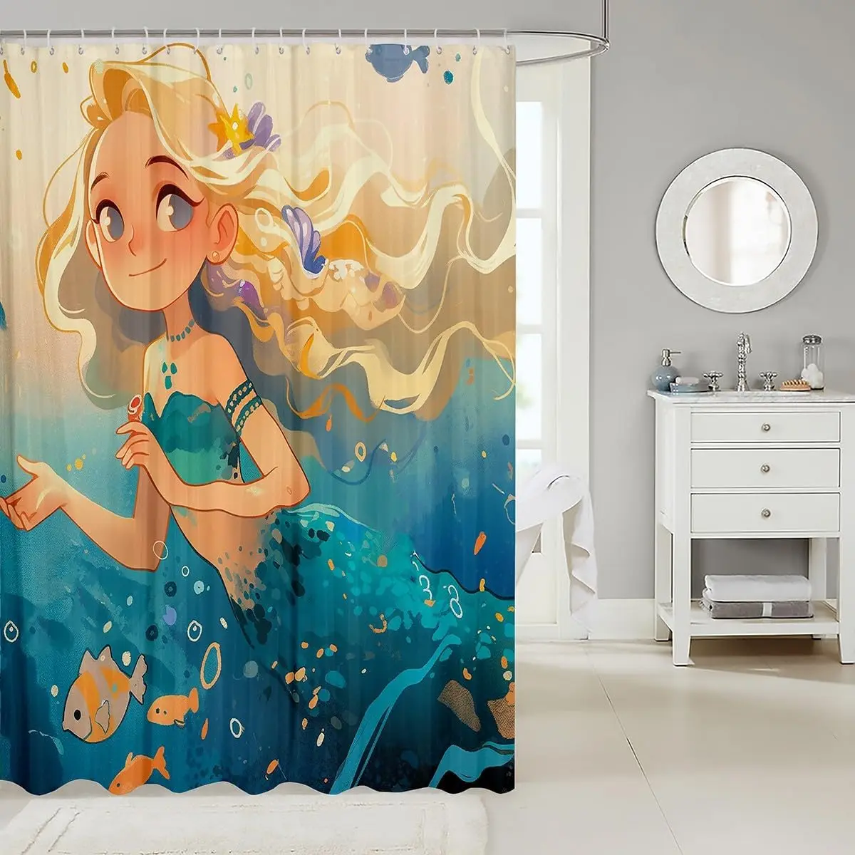ม่านอาบน้ำลายการ์ตูนเจ้าหญิงใต้น้ำ ลายสัตว์ทะเล สำหรับตกแต่งห้องน้ำเด็ก ขนาด 180×230