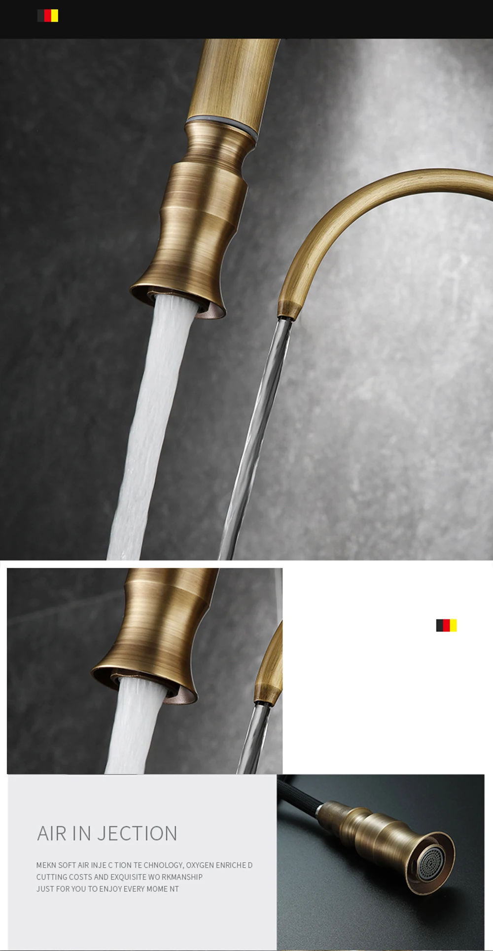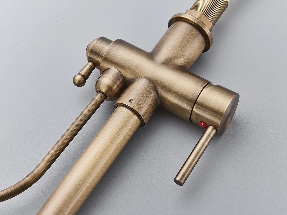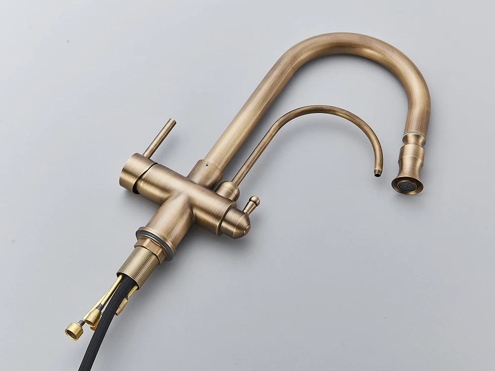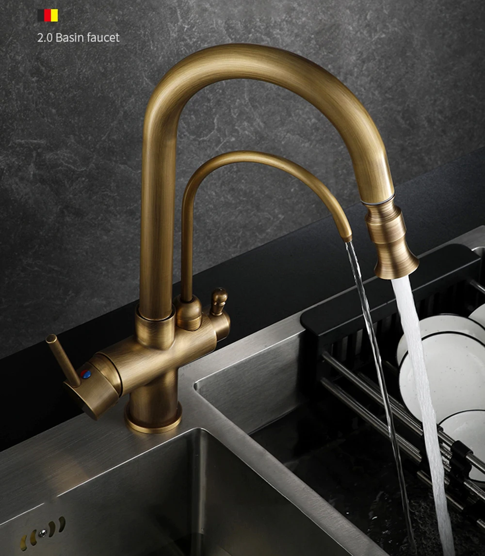 ทองเหลืองโบราณน้ำกรองก๊อกน้ำห้องครัว Dual Handle ร้อนเย็นเครื่องกรองน้ำดื่มก๊อกน้ำดึง Purification คุณลักษณะก๊อก