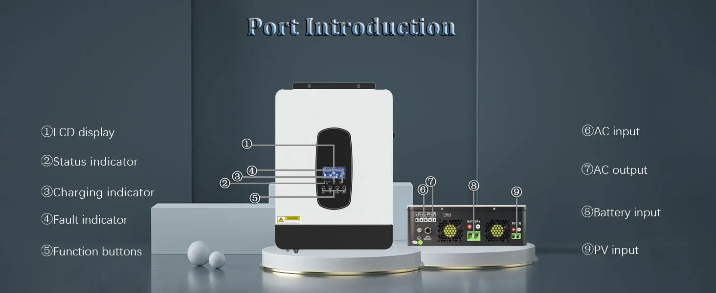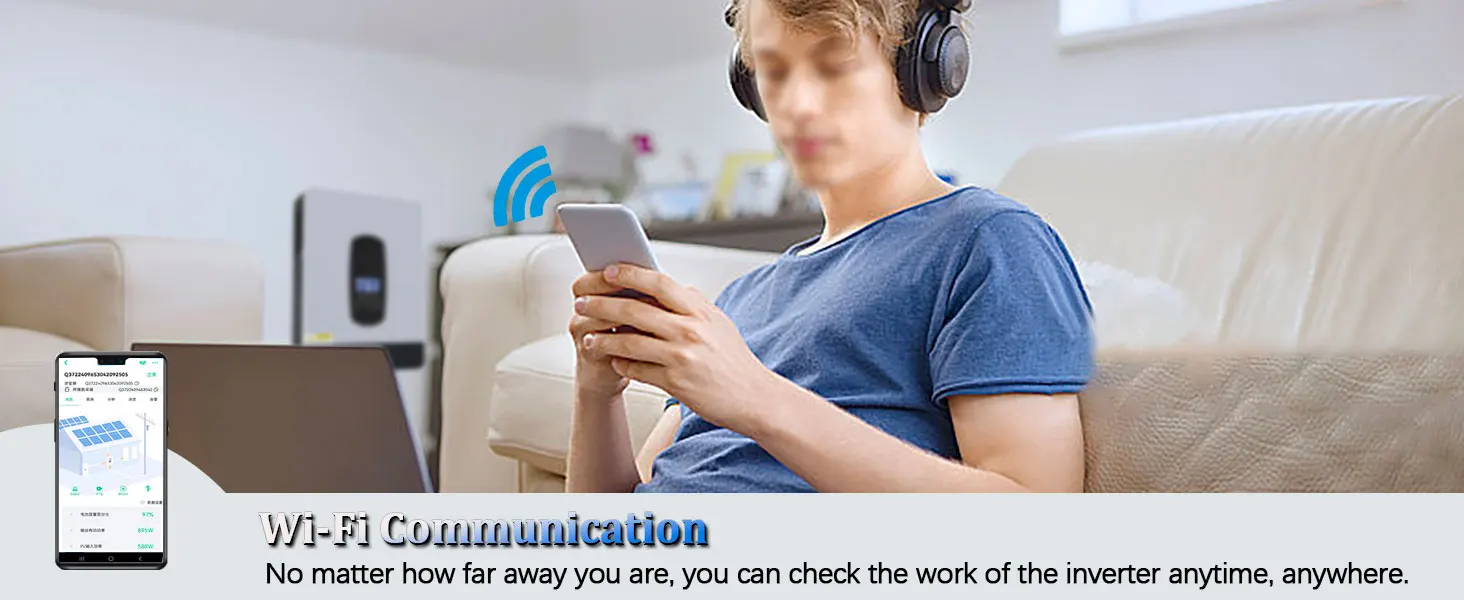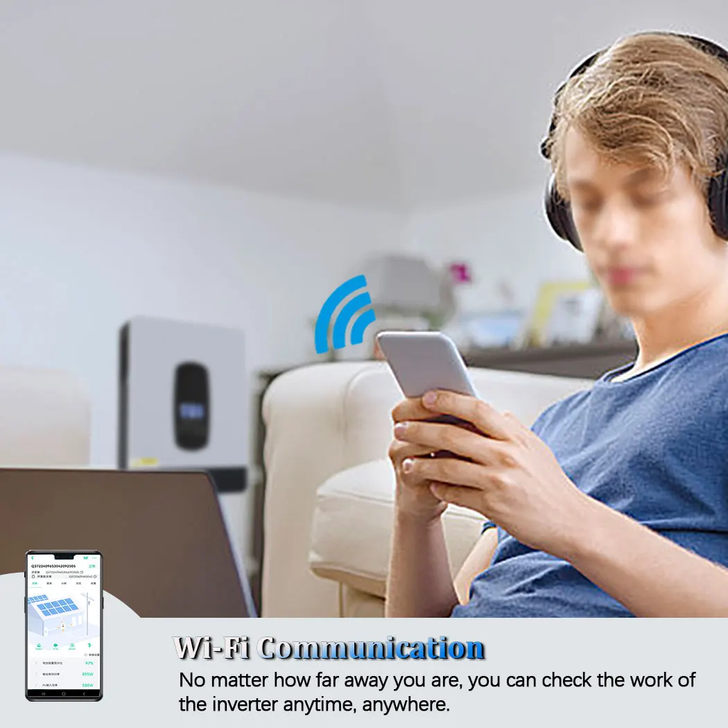 LCD display designand 3 LED indicators for dynamic display of system data and operating status, Configurable battery charging current, AC/Solar Charger priority and Load Supply Priority via LCD setting.Support WIFI remote monitoring, users can monitor the status of the PV system from the mobile phone or from the website anytime anywhere. (Not included).
