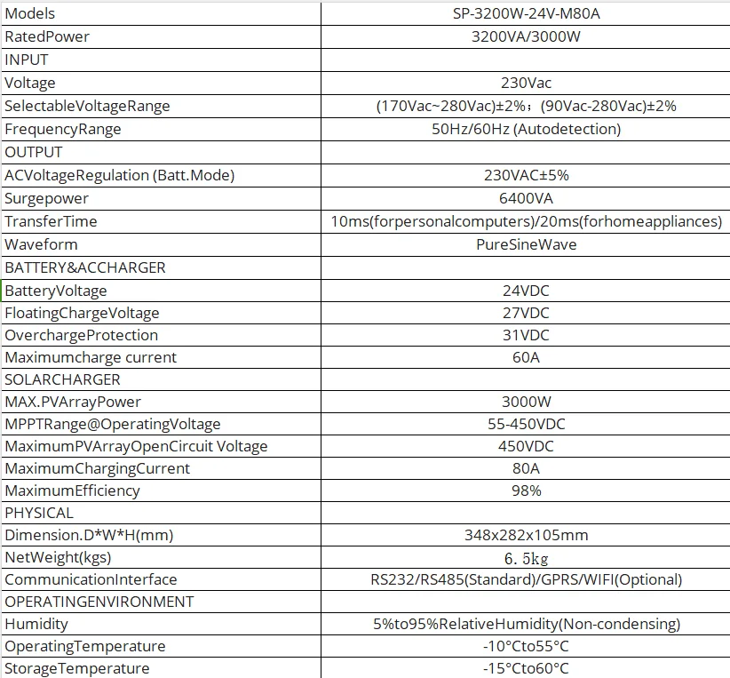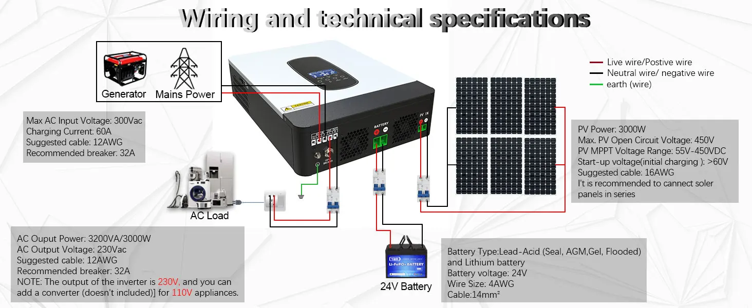 3200W Pure sine Wave Inverter 24V DC to AC 220/230/240V (Single phase/A Hot Leg 230V Output, Can’t Output 110V AC), built in 80A Mppt charge controller, is a new all-in-one hybrid solar inverter charger, fit for 24V Lead-Acid (Seal, AGM,Gel, Flooded) and Lithium battery
