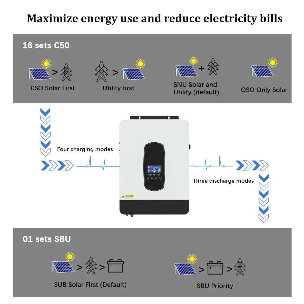 Off Grid Solar Inverter have 4 charging modes are optional, i.e. Only Solar, Mains Frist , Solar Frist and Mains & Solar hybrid charging;and 3 output modes are available, i.e. Solar Frist, Mains Frist and SBU Priority, uninterrupted power supply to meet different application requirements. And compatible to mains voltage or generator power, Auto restart while AC is recovering.