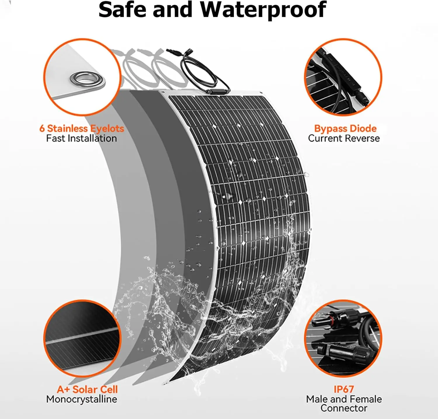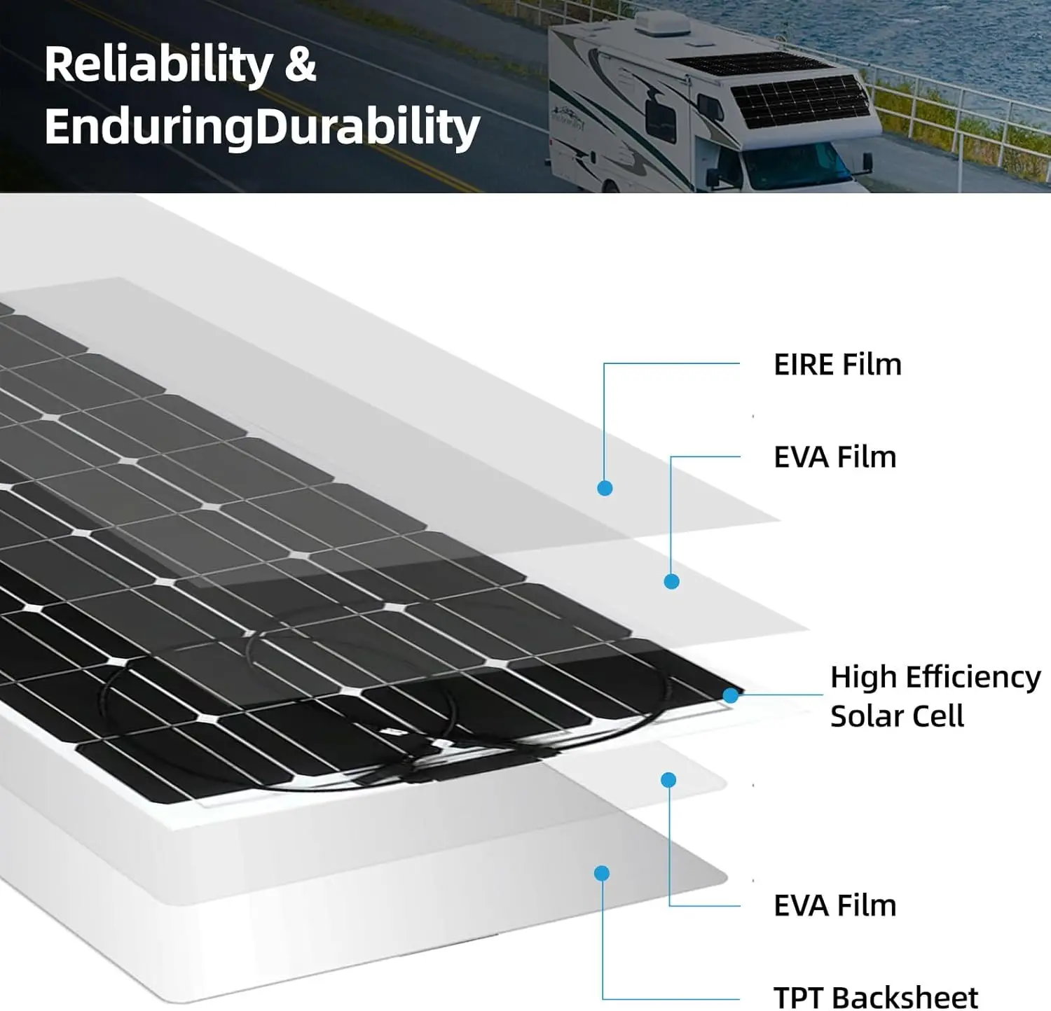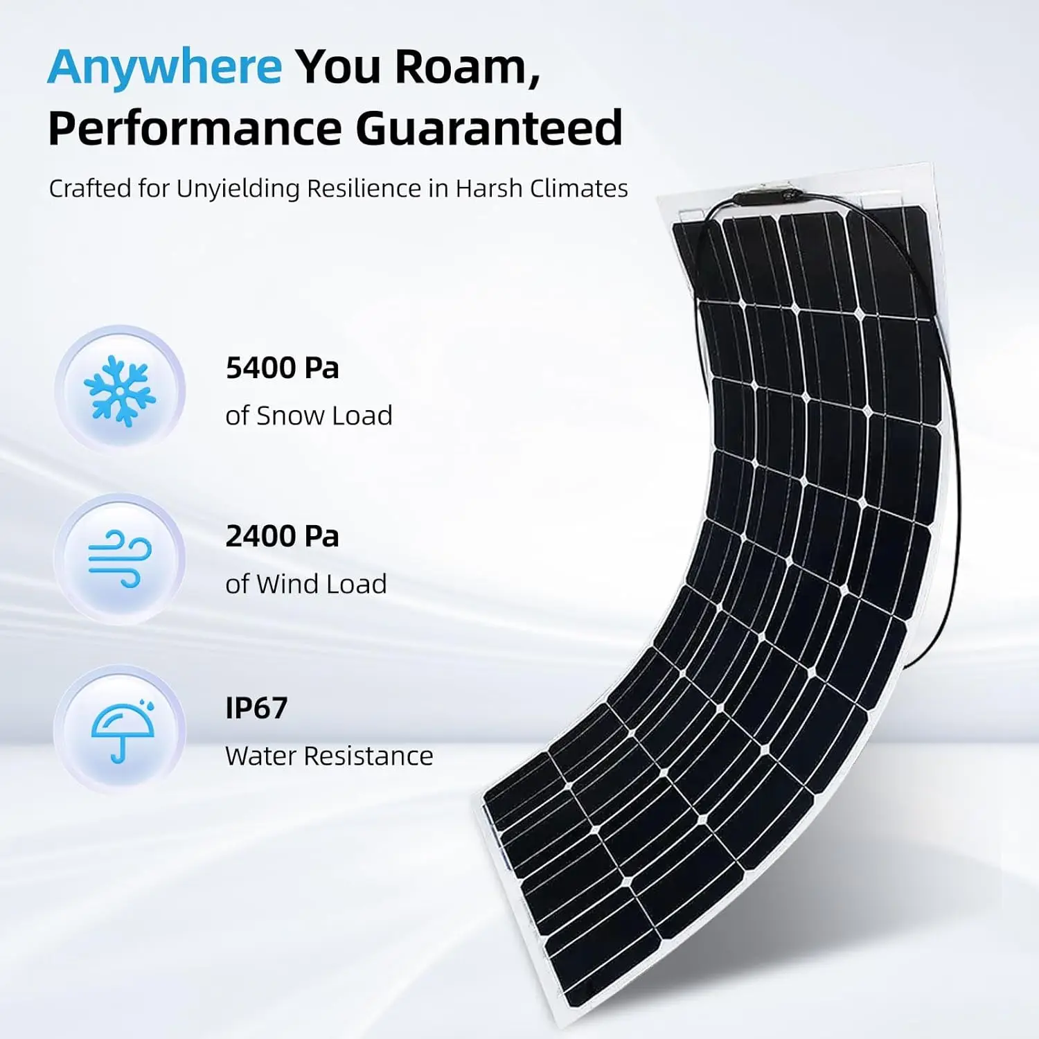 ผลิตพลังงาน 1 กิโลวัตต์ชั่วโมงต่อวัน และใช้เวลาเพียง 4 ชั่วโมงในการชาร์จด้วยแสงอาทิตย์เหมาะสำหรับการชาร์จแบตเตอรี่ 12V/24V ใช้งานได้กับรถบ้าน (RV), เรือ, เต็นท์ และหลังคา รวมถึงพื้นผิวที่ไม่เรียบ
