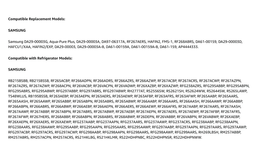 Samsung DA29-00003G, Aqua-Pure Plus, DA29-00003A, DA97-06317A, RF267AERS, HAFIN2, FMS-1, RF268ABRS, DA61-00159, DA29-00003D, HAFCU1/XAA, HAFIN2/EXP, DA29-00003, DA29-00003A-B, DA61-00159A, DA61-00159A-B, DA61-159, AP4444333.
