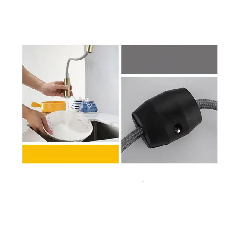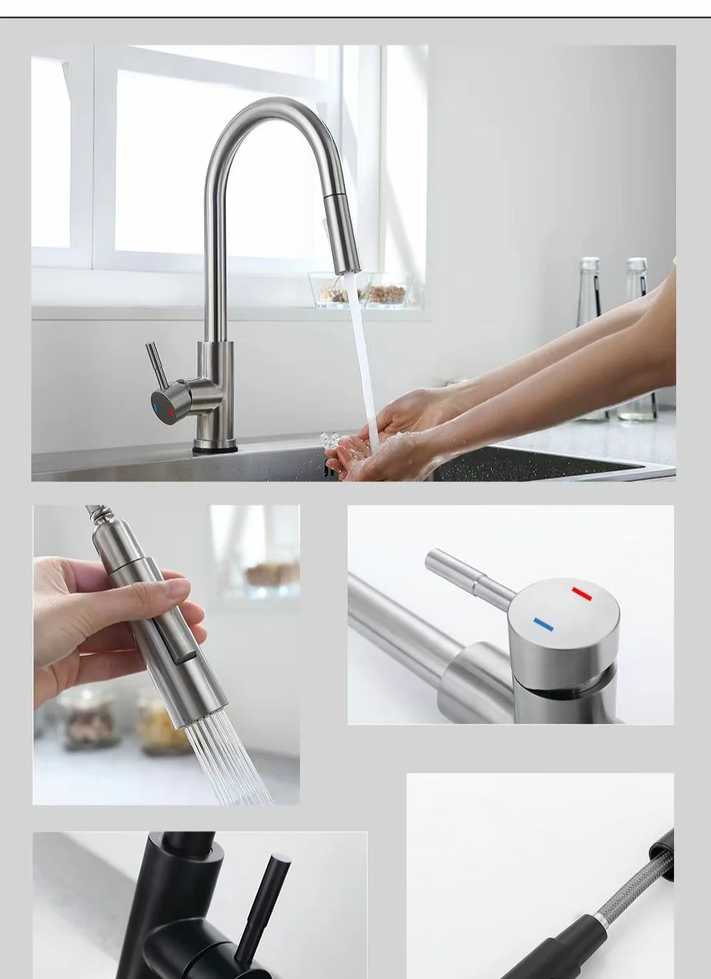 ก๊อกน้ำห้องครัวสีดำแบบยืดหยุ่น หัวฉีดแบบดึงออกได้ 2 โหมด น้ำร้อนน้ำเย็น ก๊อกผสมติดตั้งบนเคาน์เตอร์ หัวฉีดแบบสเปรย์และแบบสายฉีด วัสดุ SUS 304
