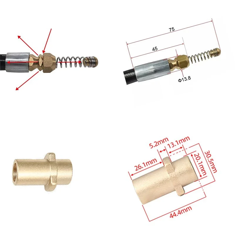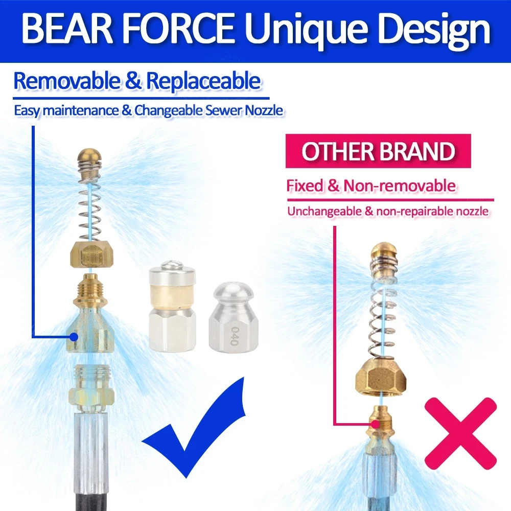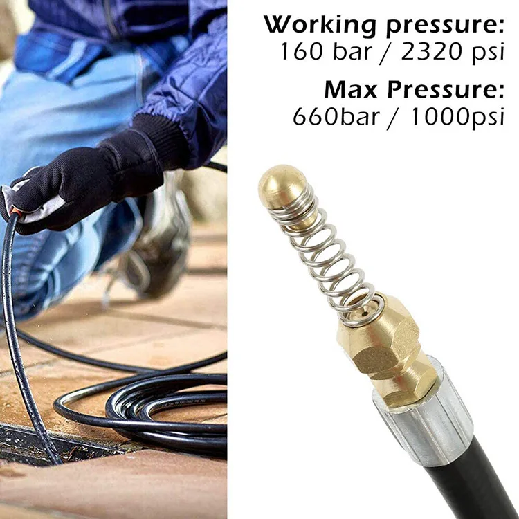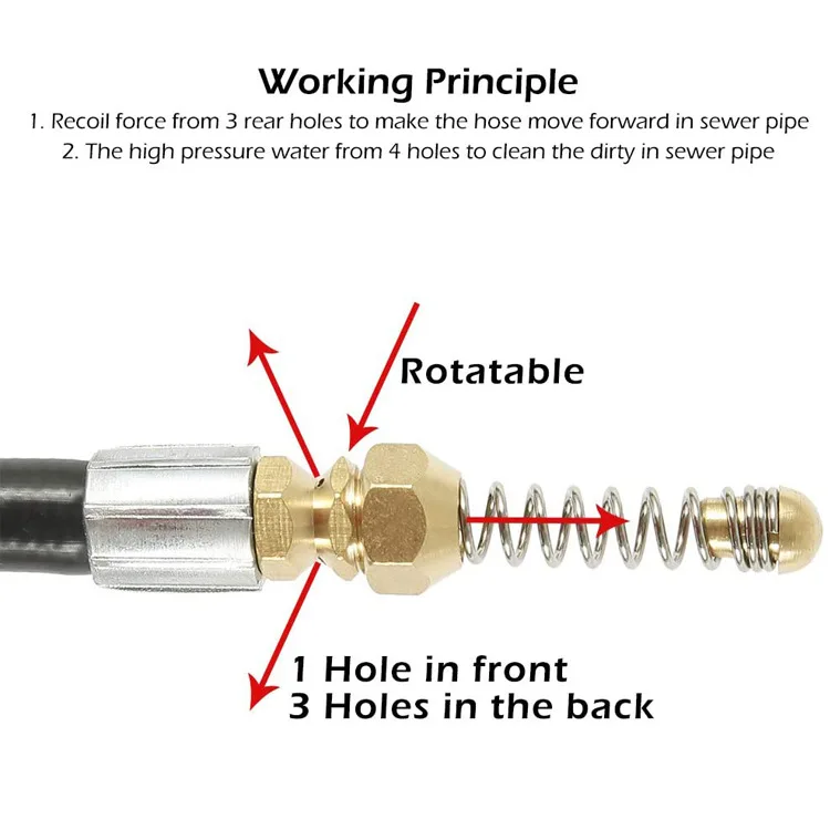 3.หัวฉีดน้ำแรงดันสูงสำหรับท่อระบายน้ำที่มีประสิทธิภาพและถอดเปลี่ยนได้: หัวฉีดน้ำแรงดันสูงนี้มาพร้อมกับรูฉีดน้ำ 4 รู – รวมถึงรูฉีดด้านหน้า 1 รูที่มุม 0° ที่ช่วยขจัดสิ่งอุดตันในท่อที่อุดตัน พร้อมหัวฉีดด้านหลัง 3 หัวที่มุม 33 องศา° ชะล้างเศษสิ่งสกปรกที่ถูกปล่อยออกมาจากหัวฉีดด้านหน้าหัวสปริงที่ยืดหยุ่นอยู่ด้านหน้าหัวฉีด ช่วยในการปรับทิศทางการหมุน และทำให้สายยางทำความสะอาดท่อระบายน้ำสามารถผ่านบริเวณข้อศอกและมุมต่างๆ ในท่อระบายน้ำและท่อระบายได้อย่างง่ายดาย