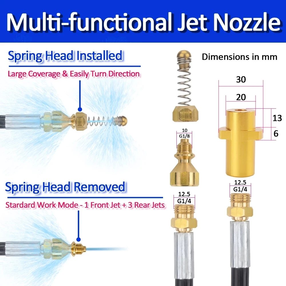 3.หัวฉีดน้ำแรงดันสูงสำหรับท่อระบายน้ำที่มีประสิทธิภาพและถอดเปลี่ยนได้: หัวฉีดน้ำแรงดันสูงนี้มาพร้อมกับรูฉีดน้ำ 4 รู – รวมถึงรูฉีดด้านหน้า 1 รูที่มุม 0° ที่ช่วยขจัดสิ่งอุดตันในท่อที่อุดตัน พร้อมหัวฉีดด้านหลัง 3 หัวที่มุม 33 องศา° ชะล้างเศษสิ่งสกปรกที่ถูกปล่อยออกมาจากหัวฉีดด้านหน้าหัวสปริงที่ยืดหยุ่นอยู่ด้านหน้าหัวฉีด ช่วยในการปรับทิศทางการหมุน และทำให้สายยางทำความสะอาดท่อระบายน้ำสามารถผ่านบริเวณข้อศอกและมุมต่างๆ ในท่อระบายน้ำและท่อระบายได้อย่างง่ายดาย
