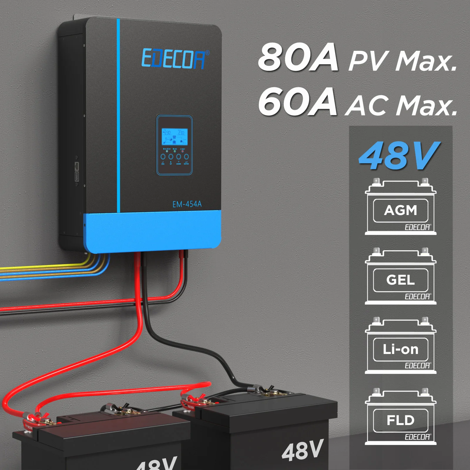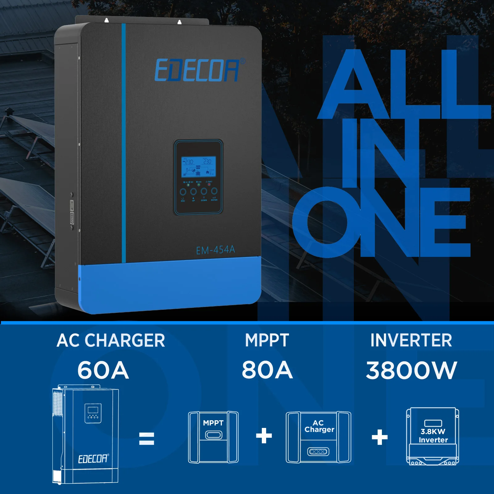 EDECOA 3.8KW Hybrid Solar Inverters Pure Sine Wave Off Grid อินเวอร์เตอร์ 48V to 220V 230V 80A MPPT AC Charger & โมดูล WiFi