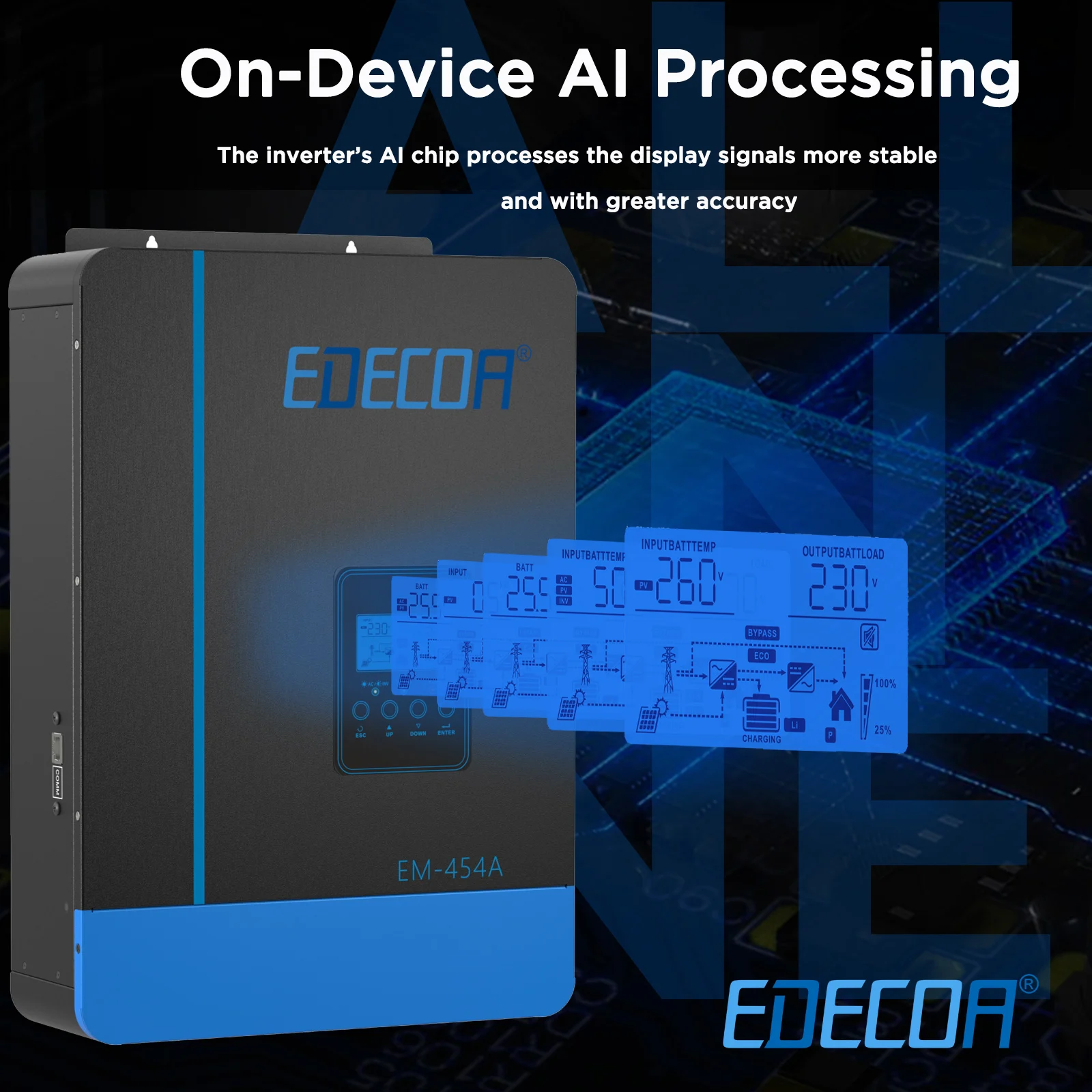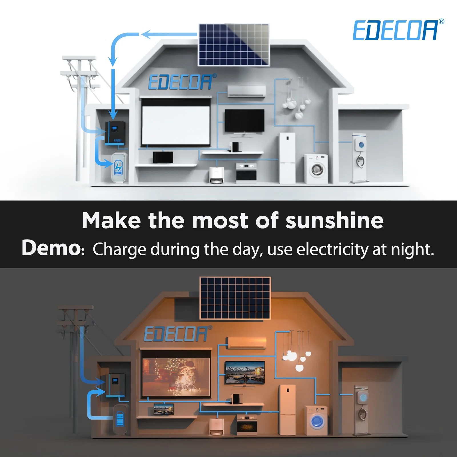 เพิ่มการใช้พลังงานแสงอาทิตย์ให้สูงสุดด้วยอินเวอร์เตอร์ไฮบริดของ EDECOAชาร์จระหว่างวันและใช้พลังงานที่เก็บไว้ในเวลากลางคืน เพื่อให้มั่นใจว่ามีการจ่ายพลังงานสม่ําเสมอ รวมถึงแต่ไม่จํากัดเพียงฟังก์ชันเหล่านี้ระบบนี้ปรับการชาร์จพลังงานแสงอาทิตย์ให้เหมาะสมเพื่อการจัดการพลังงานที่มีประสิทธิภาพในที่พักอาศัยและเชิงพาณิชย์