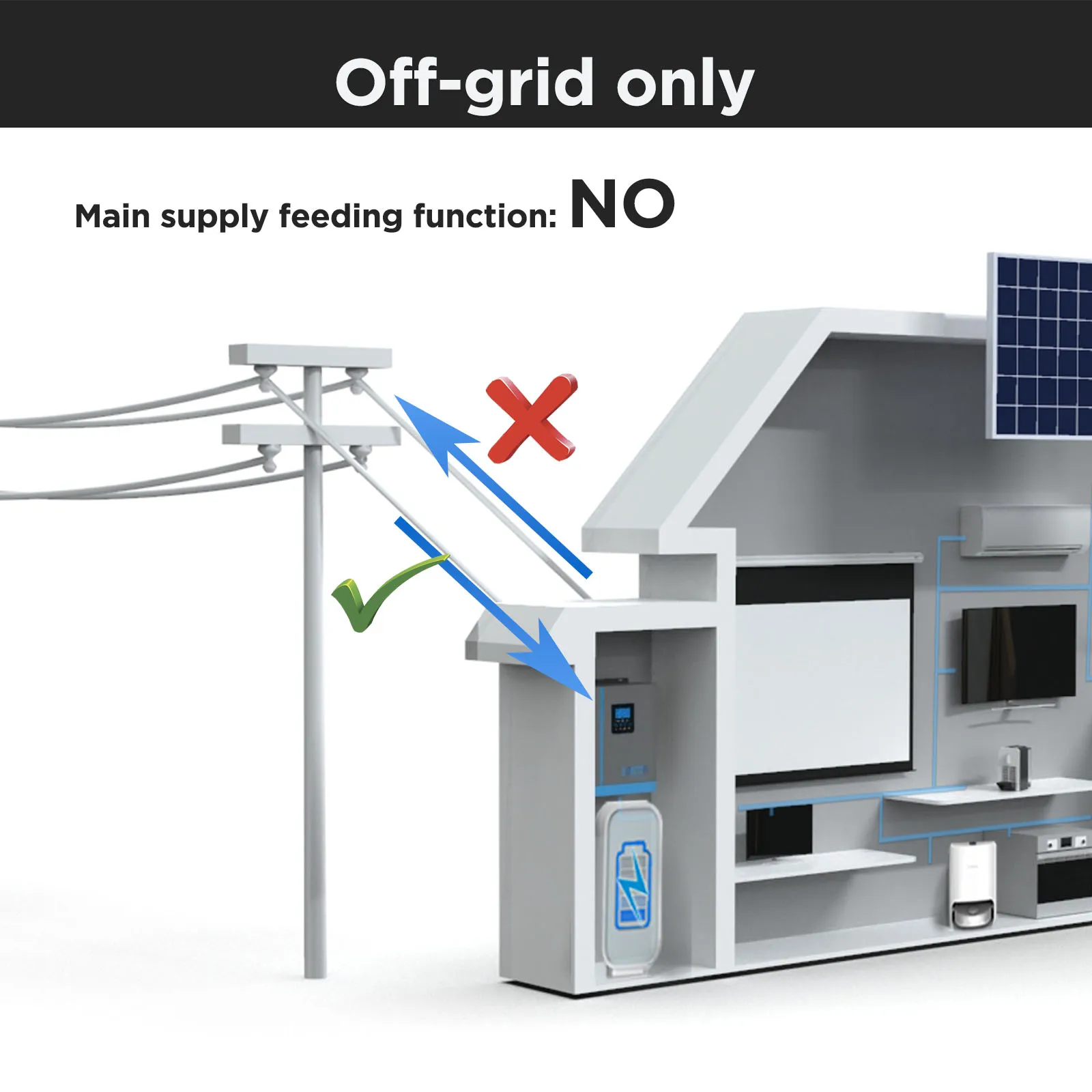 ฟังก์ชันนอกกริดเท่านั้น: อินเวอร์เตอร์ EDECOA ทํางานเฉพาะในโหมดนอกกริดเก็บพลังงานส่วนเกินไว้ในแบตเตอรี่โดยไม่ต้องป้อนกลับเข้าสู่โครงข่าย เหมาะอย่างยิ่งสําหรับการเป็นอิสระด้านพลังงานอย่างแท้จริง