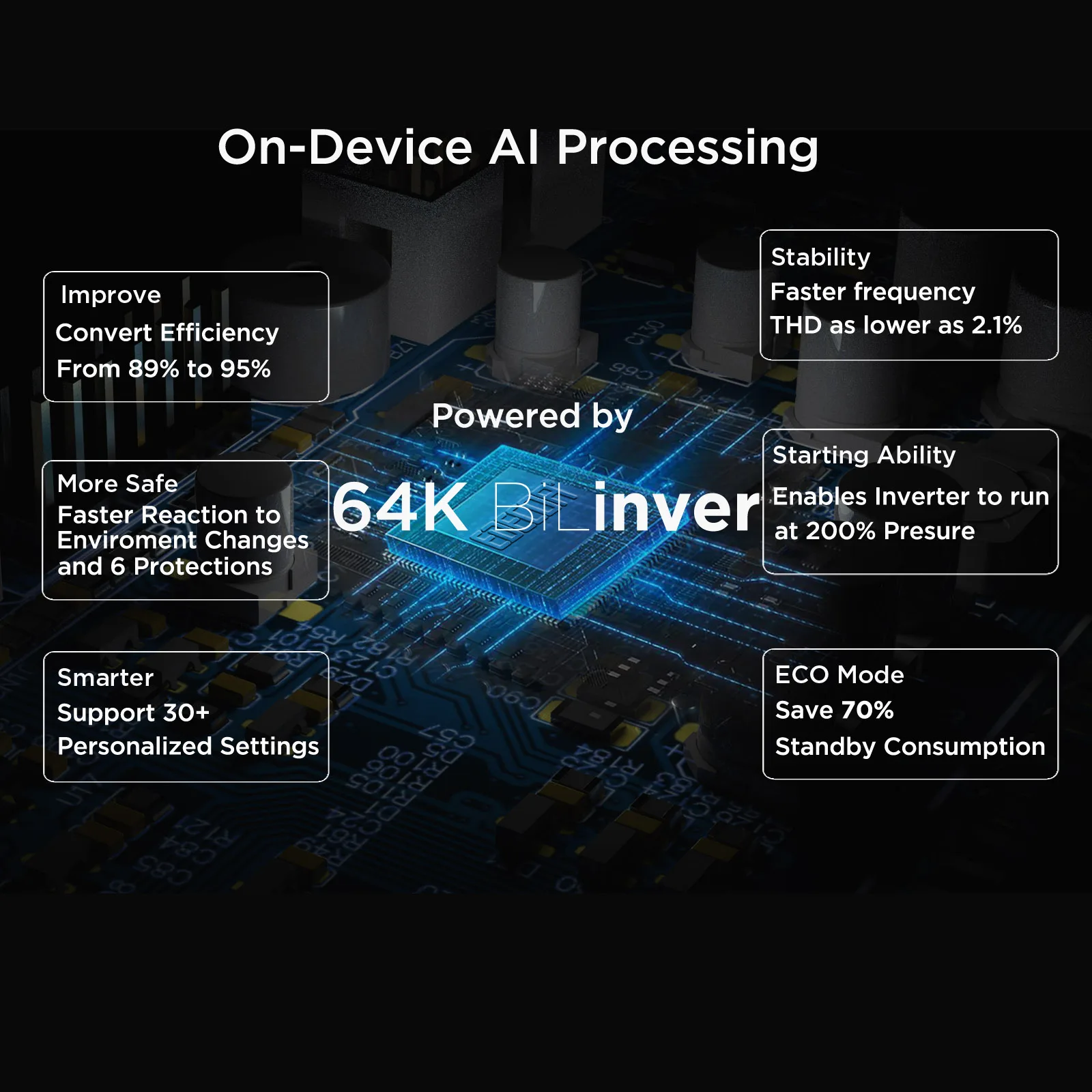 อินเวอร์เตอร์ไฮบริดของเราขับเคลื่อนโดยชิป MCU และ DSP มอบประสิทธิภาพที่ยอดเยี่ยมและการจัดการพลังงานชิป MCU ช่วยให้มั่นใจในการควบคุมที่แม่นยําภายใต้สภาวะที่แตกต่างกัน ในขณะที่ชิป DSP ให้การประมวลผลสัญญาณที่มีประสิทธิภาพสําหรับการวิเคราะห์และแปลงข้อมูลแบบเรียลไทม์