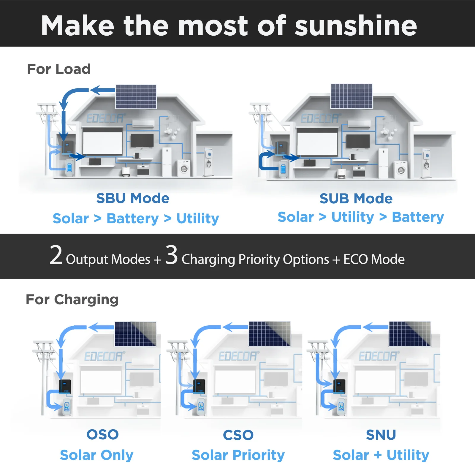 ด้วยโหมดเอาต์พุตสองโหมดและความสําคัญในการชาร์จสามประการ Hybrid Inverter ของ EDECOA จะปรับให้เข้ากับความต้องการด้านพลังงานของคุณเลือกระหว่างลําดับความสําคัญ SUB (พลังงานแสงอาทิตย์-Utility-Battery) หรือ SBU (พลังงานแสงอาทิตย์-Battery-Utility) และเพิ่มประสิทธิภาพการใช้พลังงานด้วยโหมดลําดับความสําคัญของพลังงานแสงอาทิตย์ พลังงานแสงอาทิตย์และยูทิลิตี้ หรือโหมดการชาร์จพลังงานแสงอาทิตย์เท่านั้นโหมด ECO ลดการใช้ไม่ได้ใช้งานให้เหลือน้อยที่สุดเพื่อการใช้พลังงานอย่างมีประสิทธิภาพ