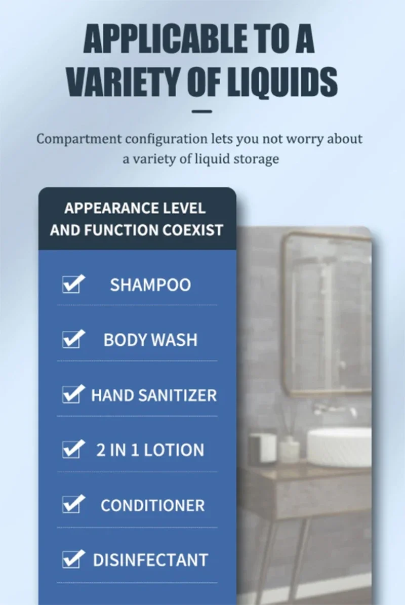 การออกแบบที่หรูหราเรียบง่าย: ตู้ทําสบู่อาบน้ําได้รับการออกแบบในสีทึบ และชุดเครื่องจ่ายสบู่อาบน้ําสามารถรวมเข้ากับสภาพแวดล้อมในบ้านของคุณได้ดีขึ้น และทําให้บ้านของคุณดูหรูหรายิ่งขึ้น