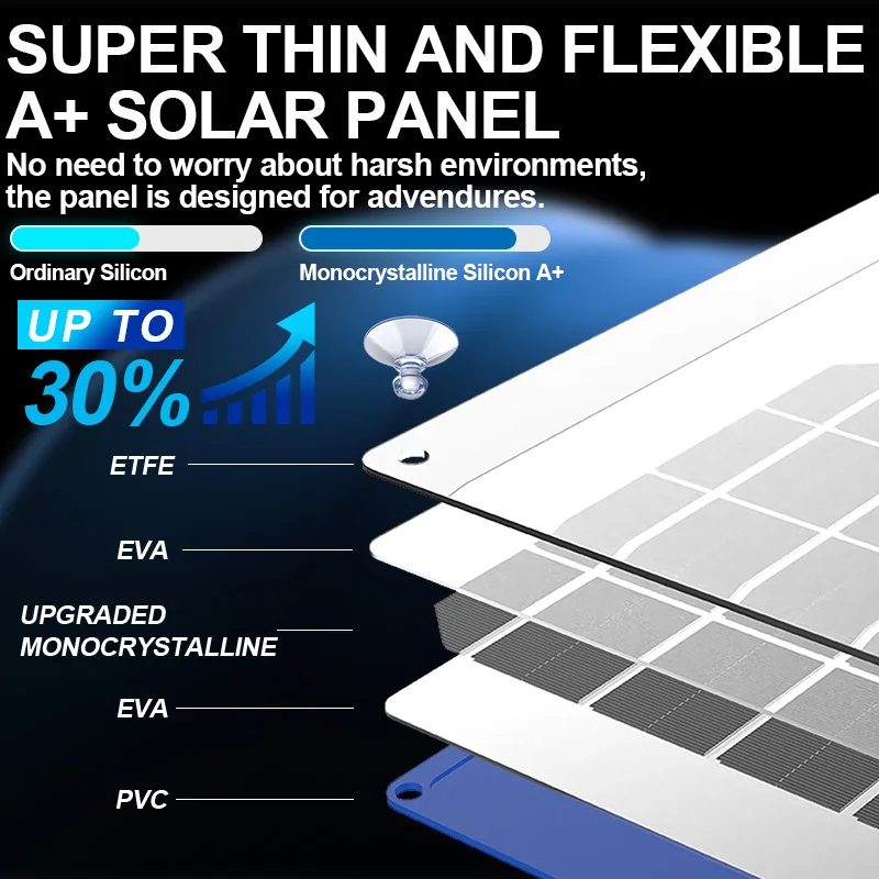 ทนทานมากขึ้น: วัสดุ PET สามารถกันน้ำและกันฝุ่นได้ มีการเพิ่มชั้นของแผ่นอีพ็อกซี่เป็นแผ่นฐาน ซึ่งช่วยเพิ่มความแข็งแรง (แผ่นที่แตกอาจทำให้ประสิทธิภาพการชาร์จลดลง) คุณสามารถติดต่อเราได้ตลอดเวลาหากคุณมีคำถามใด ๆ