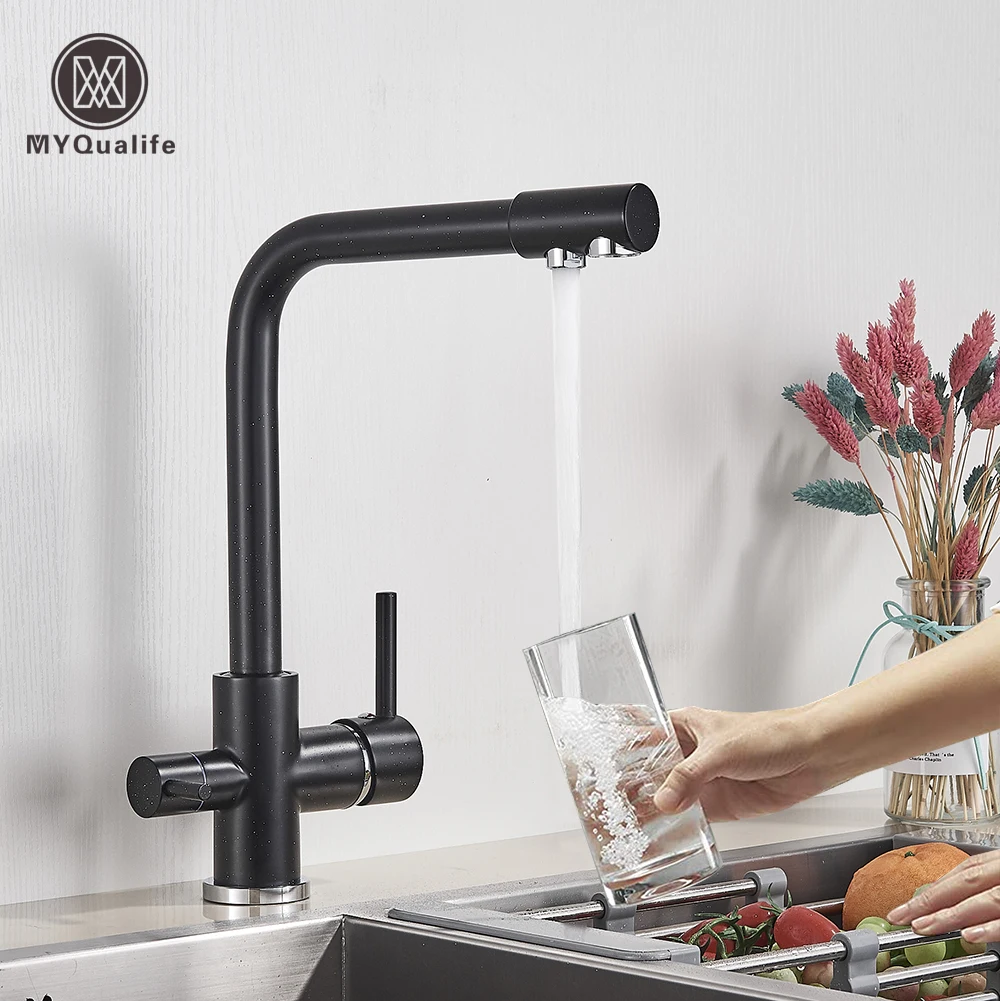 Matte สีดําทองเหลืองน้ําบริสุทธิ์ก๊อกน้ําห้องครัว Dual Handle ร้อนและเย็นน้ําดื่ม 3-Way FILTER KITCHEN Purified Mixer ก๊อก