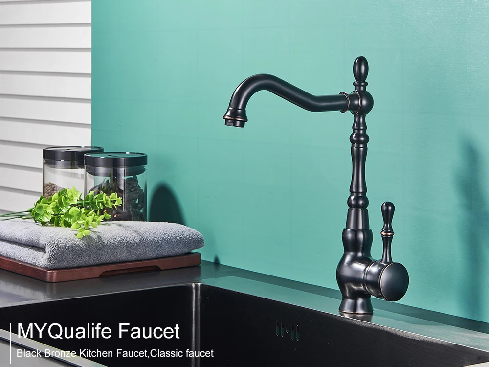 เคาน์เตอร์อ่างน้ำก๊อกน้ำสำหรับห้องครัวเดี่ยวทรงสูงก๊อกผสมทองแดงสีดำ