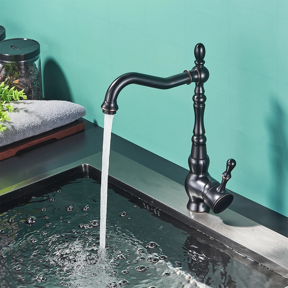 Deck Mount ก๊อกน้ำห้องครัวเดี่ยว360หมุนอ่างล้างหน้าก๊อกสีดำร้อนเย็นผสม
