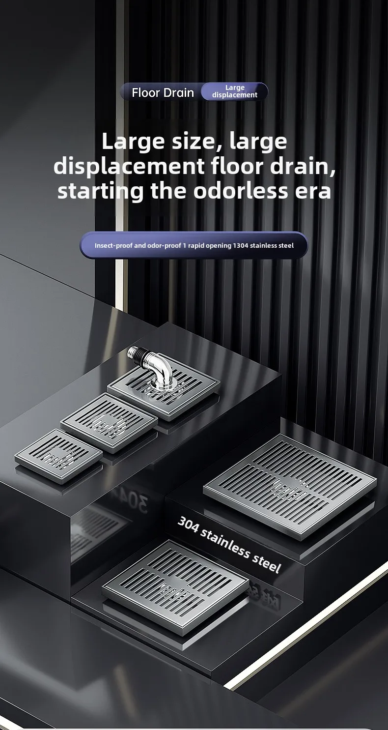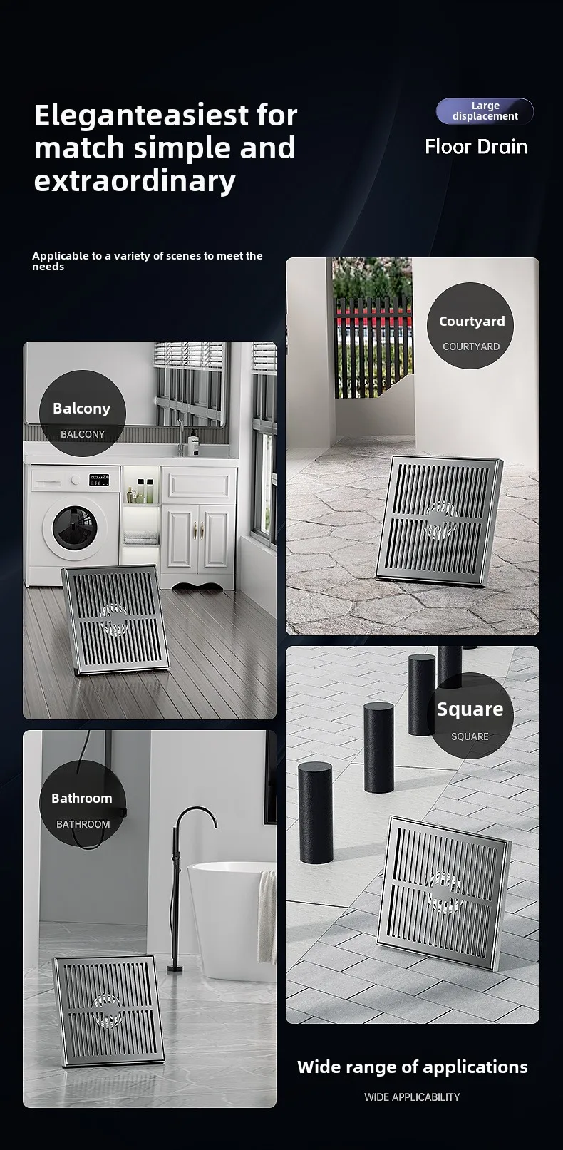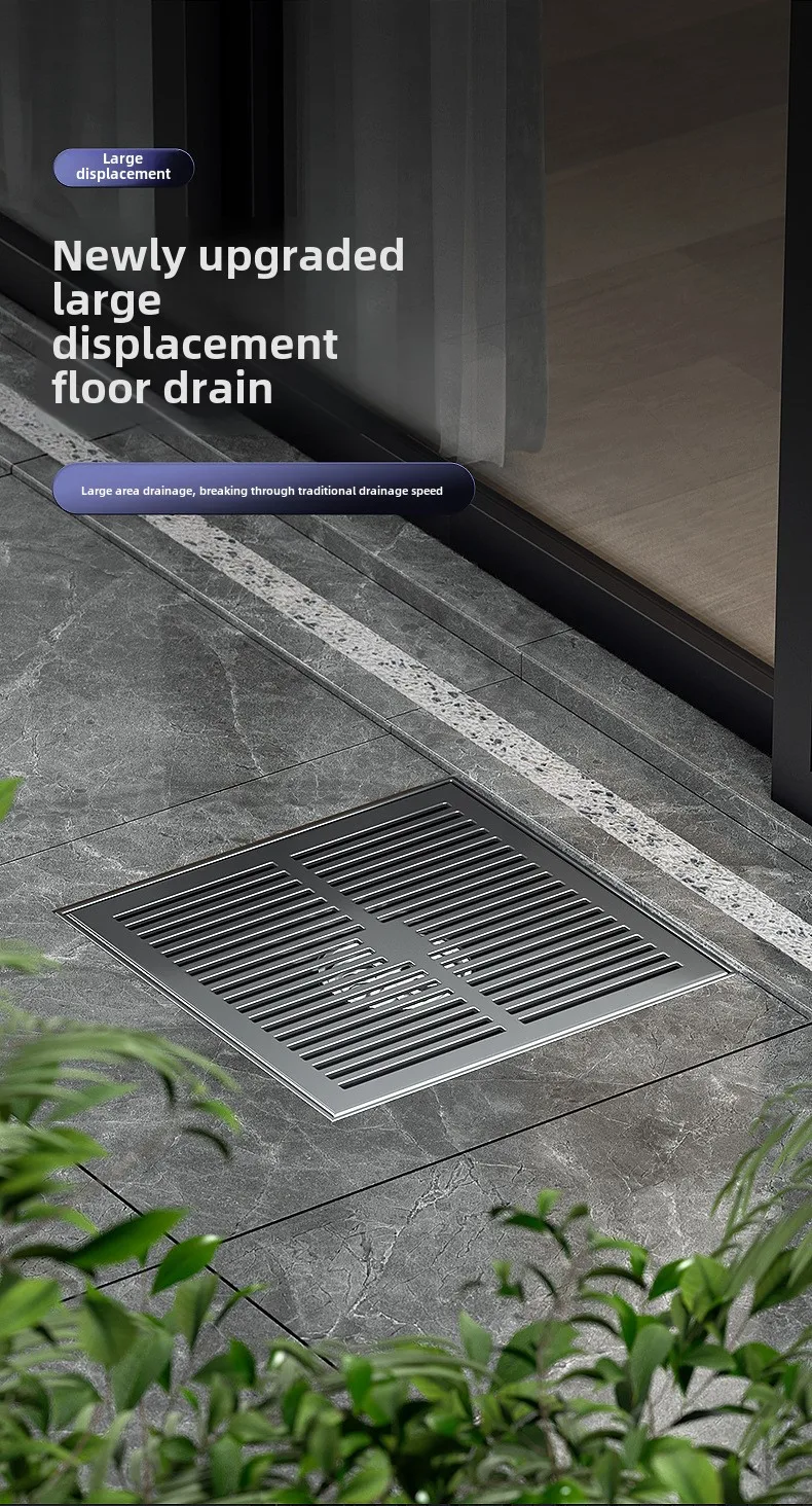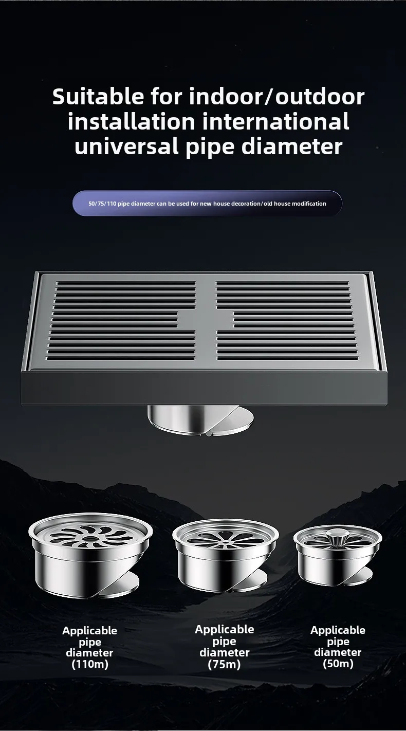 ท่อระบายน้ําพื้นสแตนเลสป้องกันกลิ่น 304, เส้นผ่านศูนย์กลางที่เพิ่มขึ้นและการเคลื่อนที่ขนาดใหญ่, บนหลังคาและลานภายในและกลางแจ้ง