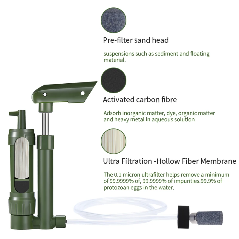 ที่กรองน้ำแบบมีที่ปั๊มมือขนาดเล็กหลอดกรองน้ำสำหรับตั้งแคมป์ทำความสะอาดแบบพกพากลางแจ้งเครื่องกรองการอยู่รอดสำหรับแคมป์ดื่มฉุกเฉิน