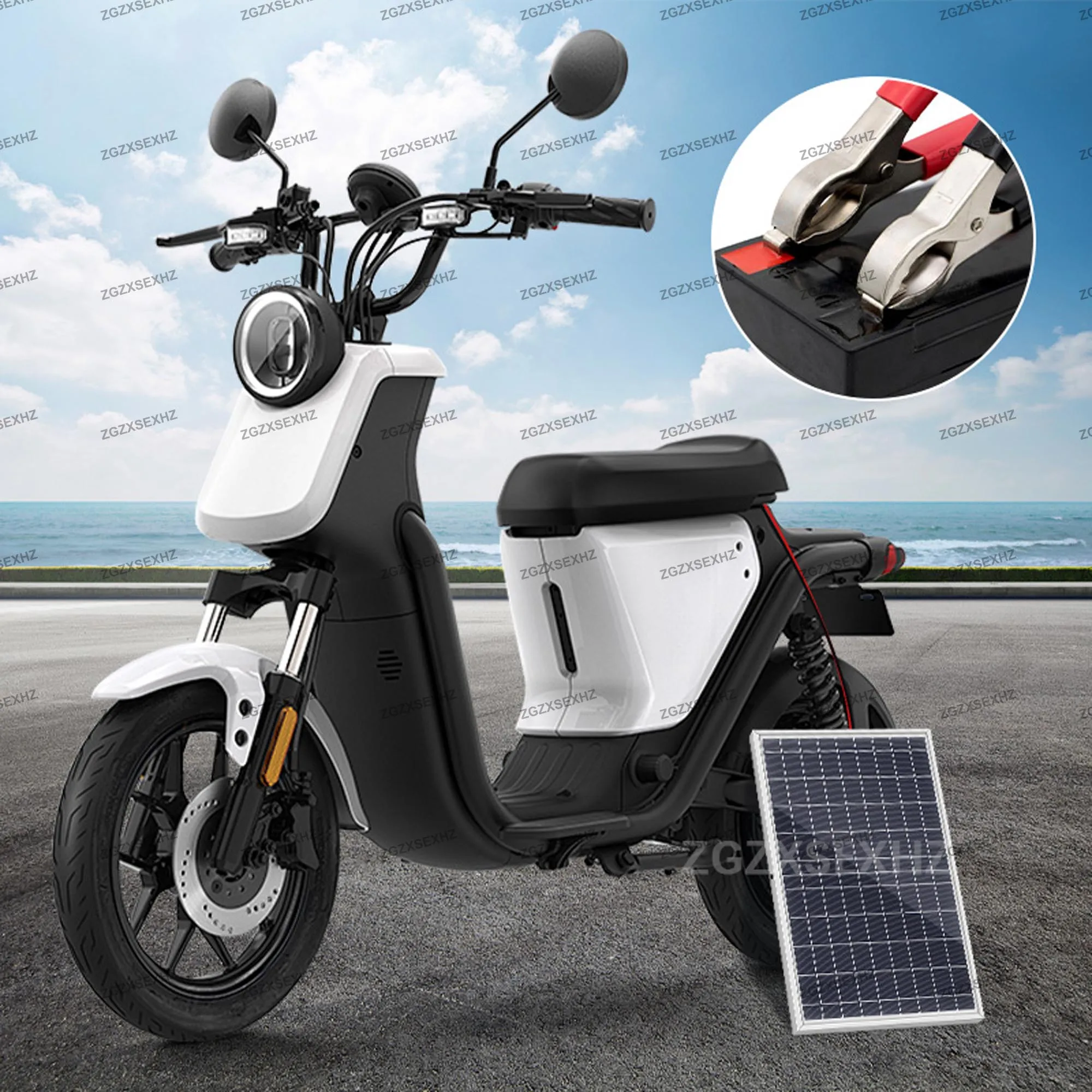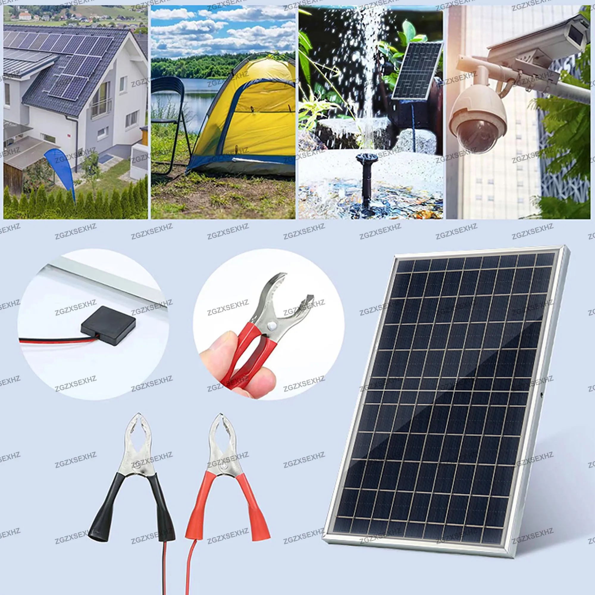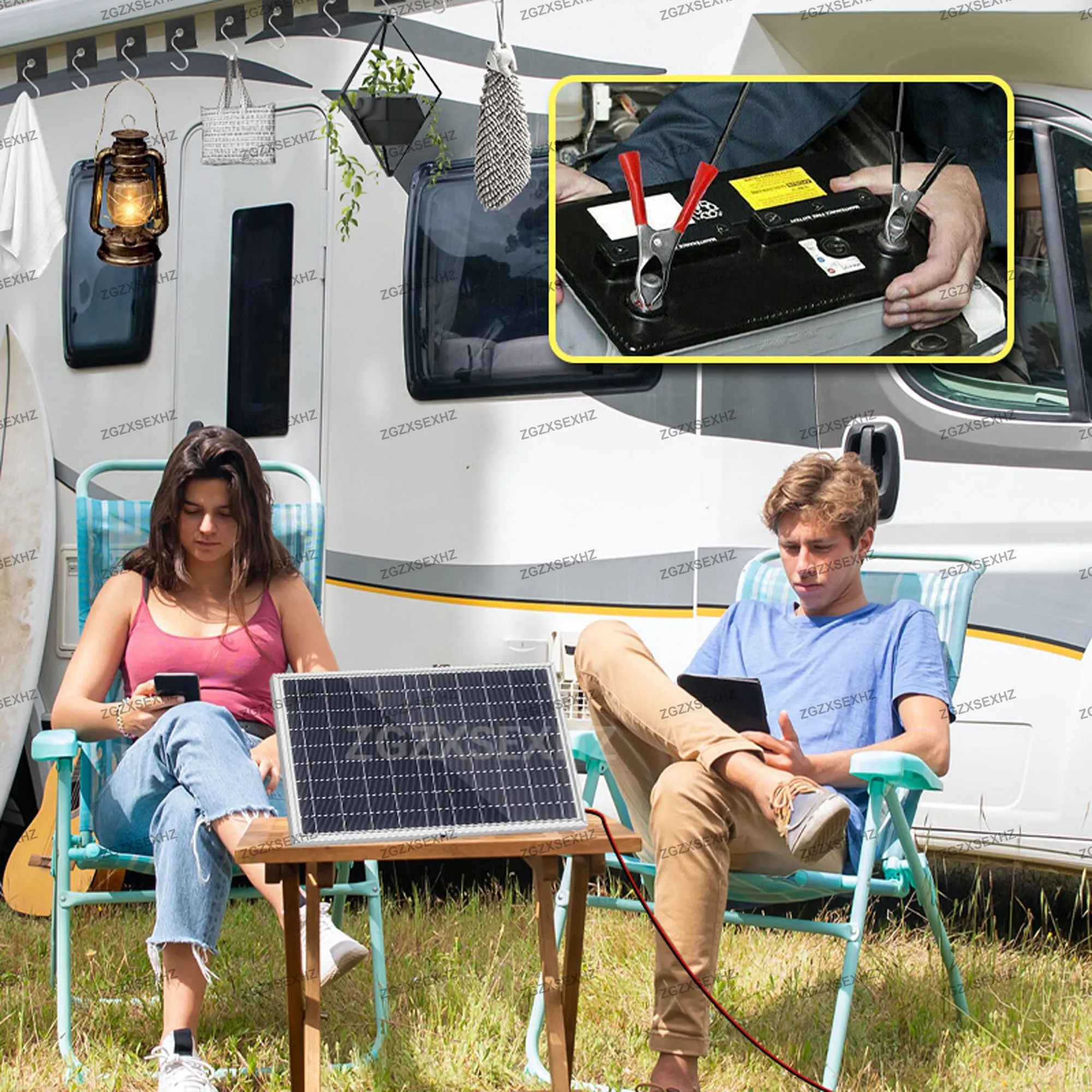 แผงโซลาร์เซลล์แบบพกพา 50 วัตต์ โครงอะลูมิเนียม แผงโซลาร์เซลล์ซิลิคอนโมโนคริสตัลไลน์ พร้อมสายเคเบิล 9.8 ฟุต DC 18V คลิปแบตเตอรี่สีแดงและสีดำ