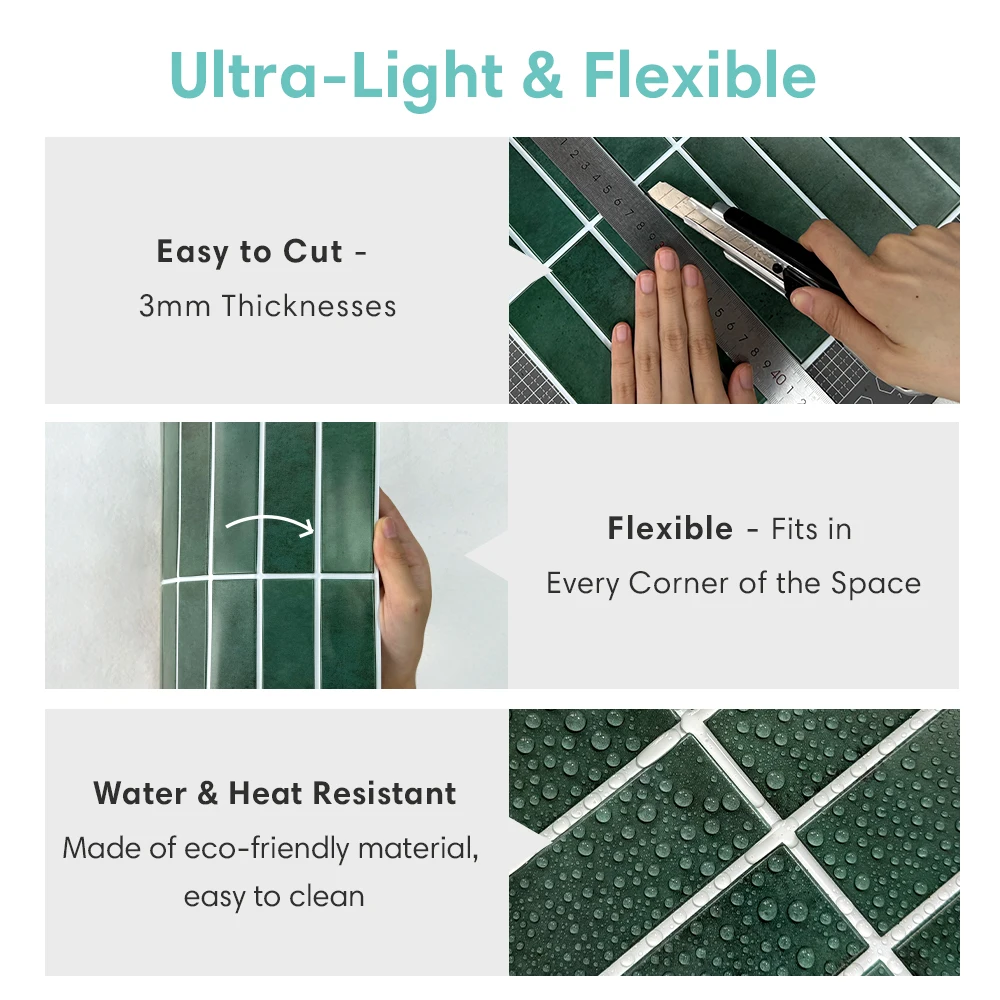 การติดตั้งที่ง่ายและรวดเร็ว: แค่ลอกแล้วติด!ไม่มียาแนว ไม่มีซีเมนต์ และไม่เลอะเทอะ!ตัดง่ายด้วยมีดอรรถประโยชน์หรือกรรไกรเหมาะสําหรับโครงการ DIY ตกแต่งผนัง