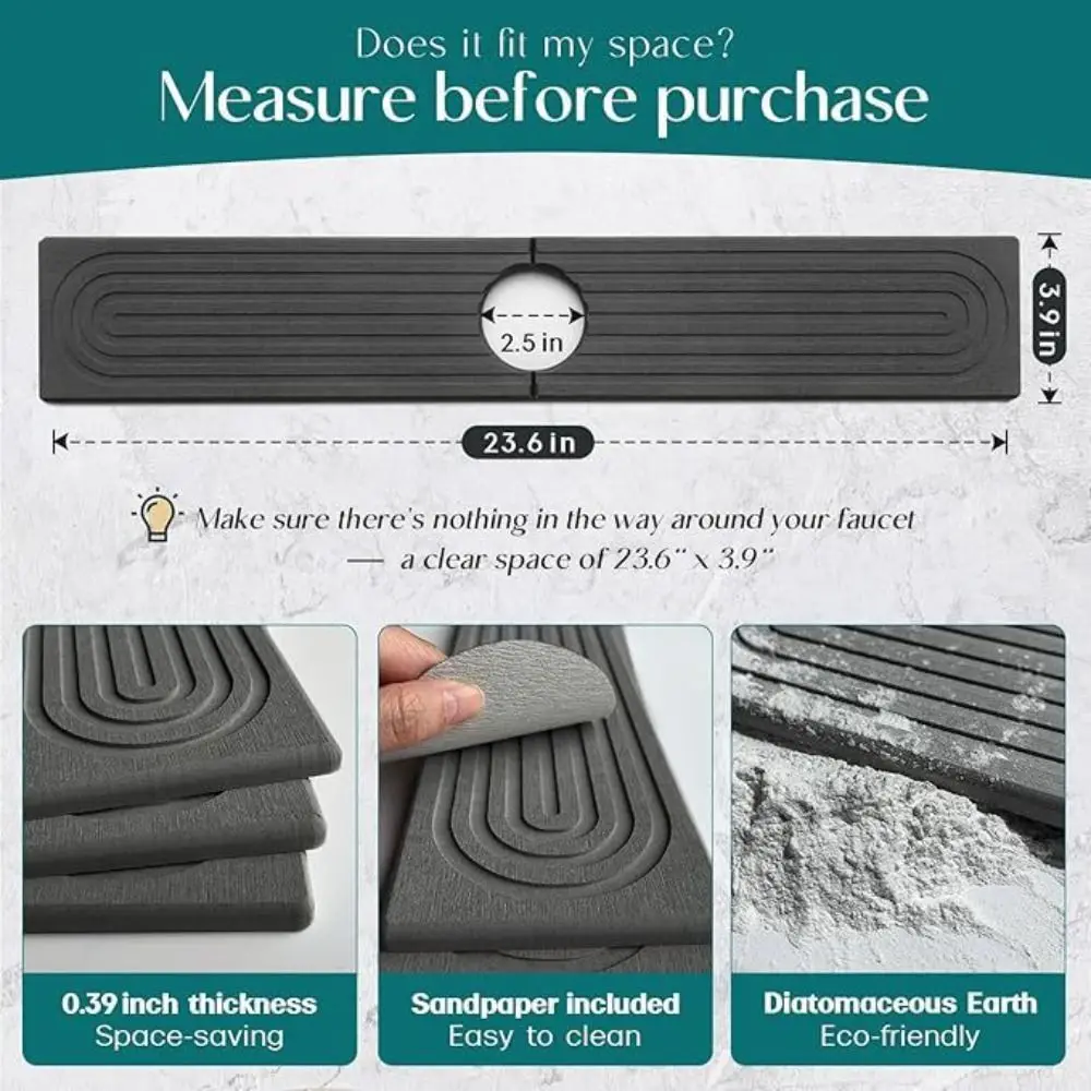 Quick Water Absorption and Fast Drying — Our fast drying stone faucet mat is made from natural diatom mud, the small pores in diatomaceous earth give it amazing water absorption.It quickly absorbs water around faucets and dries in minutes,keeping your countertop consistently dry and tidy,free from pesky water droplets.