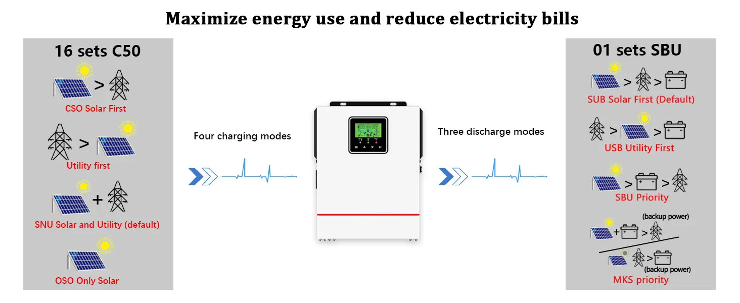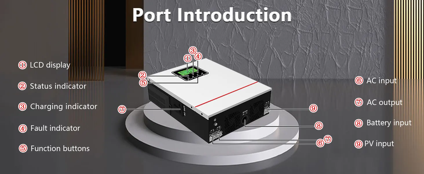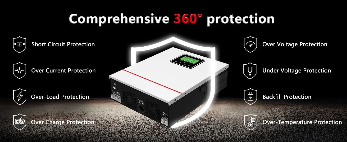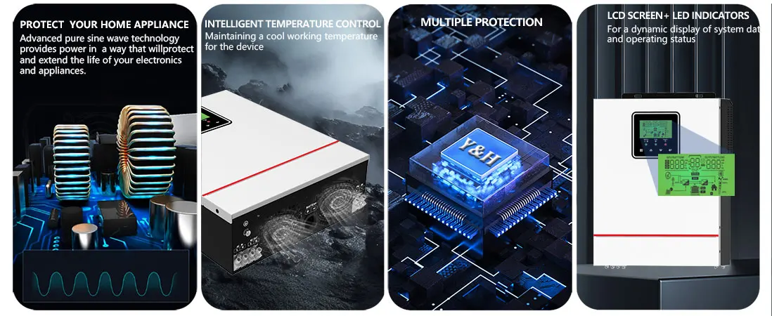 นี่คือเครื่องชาร์จอินเวอร์เตอร์แบบมัลติฟังก์ชั่น ซึ่งรวมฟังก์ชันของอินเวอร์เตอร์ เครื่องชาร์จพลังงานแสงอาทิตย์ และเครื่องชาร์จแบตเตอรี่เข้าด้วยกัน เพื่อให้การสนับสนุนพลังงานที่ไม่สะดุดด้วยขนาดพกพาตัวควบคุม MPPT ขนาด 40 แอมป์ในตัว ซึ่งรวมการจัดเก็บพลังงานแสงอาทิตย์และการชาร์จพลังงานสำรอง และเอาต์พุตคลื่นไซน์ ACสามารถนำไปใช้ได้อย่างกว้างขวางในพื้นที่ DC เป็น AC เช่น ระบบไฟฟ้ากระแสสลับพลังงานแสงอาทิตย์, ระบบยานยนต์, แหล่งจ่ายไฟ RV, ระบบตรวจสอบความปลอดภัย, ระบบไฟส่องสว่างฉุกเฉิน, ระบบไฟฟ้าภาคสนาม, ระบบไฟฟ้าในครัวเรือน และอื่นๆ