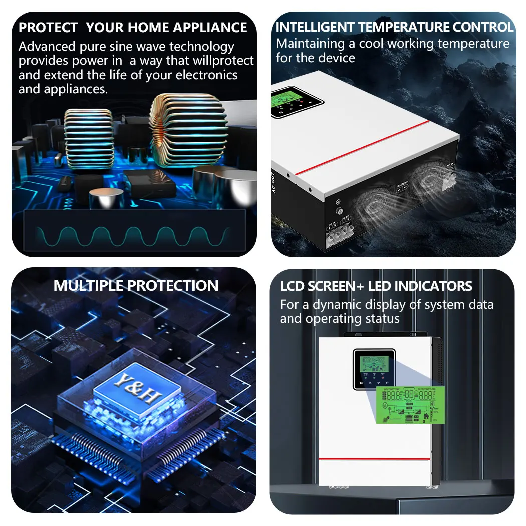 นี่คือเครื่องชาร์จอินเวอร์เตอร์แบบมัลติฟังก์ชั่น ซึ่งรวมฟังก์ชันของอินเวอร์เตอร์ เครื่องชาร์จพลังงานแสงอาทิตย์ และเครื่องชาร์จแบตเตอรี่เข้าด้วยกัน เพื่อให้การสนับสนุนพลังงานที่ไม่สะดุดด้วยขนาดพกพาตัวควบคุม MPPT ขนาด 40 แอมป์ในตัว ซึ่งรวมการจัดเก็บพลังงานแสงอาทิตย์และการชาร์จพลังงานสำรอง และเอาต์พุตคลื่นไซน์ ACสามารถนำไปใช้ได้อย่างกว้างขวางในพื้นที่ DC เป็น AC เช่น ระบบไฟฟ้ากระแสสลับพลังงานแสงอาทิตย์, ระบบยานยนต์, แหล่งจ่ายไฟ RV, ระบบตรวจสอบความปลอดภัย, ระบบไฟส่องสว่างฉุกเฉิน, ระบบไฟฟ้าภาคสนาม, ระบบไฟฟ้าในครัวเรือน และอื่นๆ