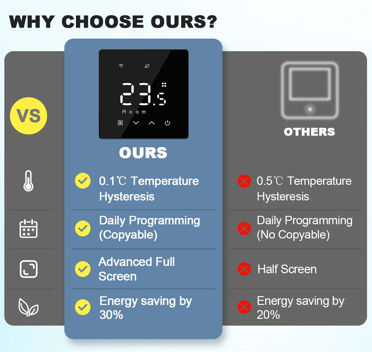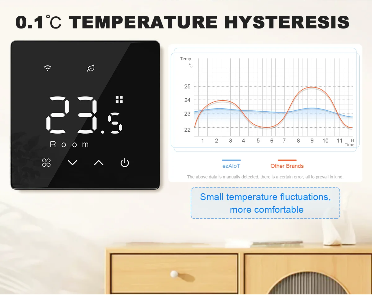 ค่าเริ่มต้นจากโรงงานคือ 0.5℃ซึ่งสามารถตั้งค่าเป็น 0.1 ได้℃, โดยมีความผันผวนของอุณหภูมิน้อยลง และความสะดวกสบายที่ดีขึ้น(*โปรดทราบ: 0.1℃ การสลับรีเลย์มีความถี่มากขึ้น ดังนั้นการใช้พลังงานจึง > 0.5℃.หากคุณไม่สะดวกใจ กรุณาใช้ค่ามาตรฐาน