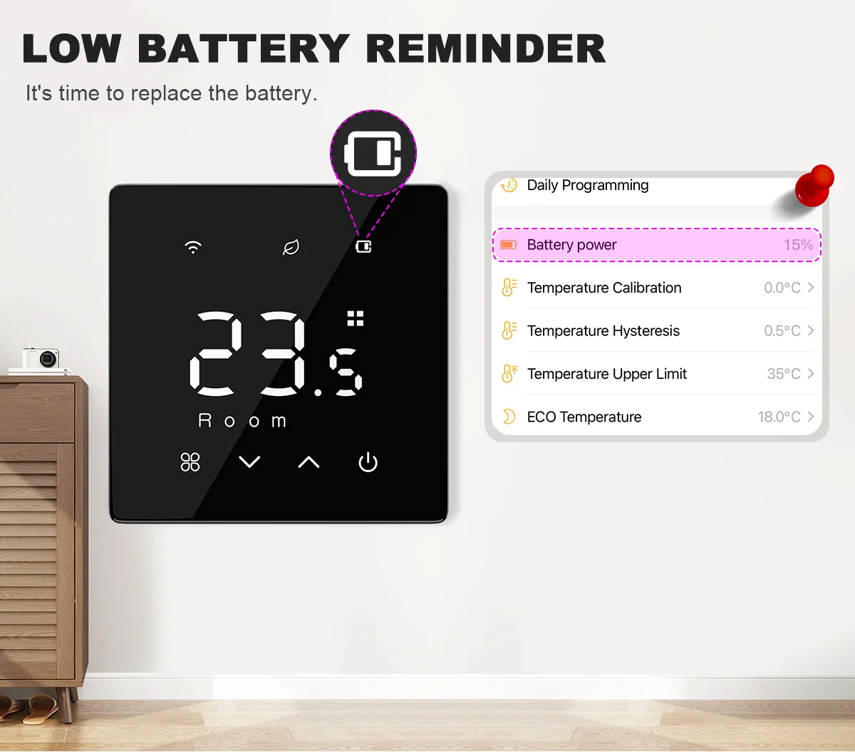 เมื่อพลังงานแบตเตอรี่เหลือน้อยกว่า 20% เทอร์โมสตัทและแอปจะแจ้งเตือนล่วงหน้า เพื่อให้มีเวลาเพียงพอในการเปลี่ยนแบตเตอรี่