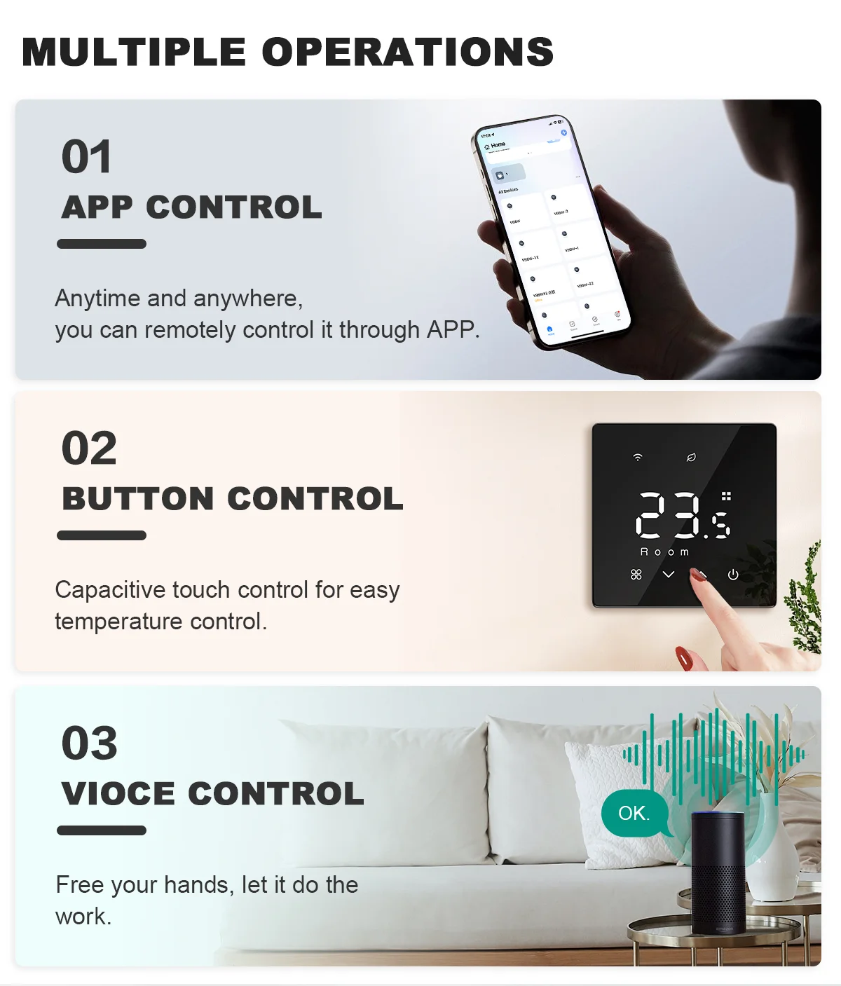 รองรับการควบคุมด้วยปุ่มบนตัวเครื่อง, การควบคุมระยะไกลผ่านแอปพลิเคชัน และการควบคุมด้วยเสียงผ่านลำโพงชั้นนำ