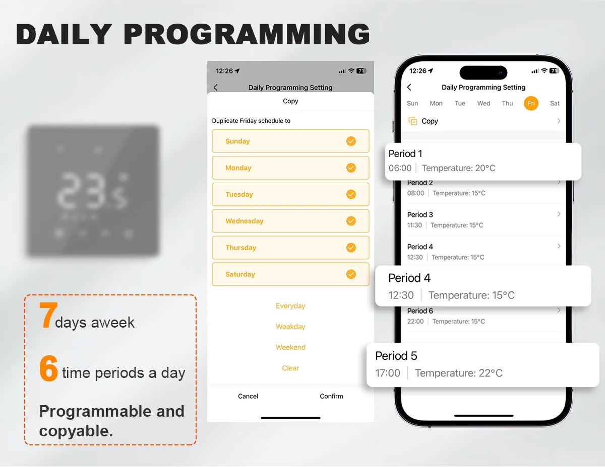 รองรับ 6 ช่วงเวลาต่อวันเป็นเวลา 7 วันต่อสัปดาห์ และสามารถตั้งโปรแกรมแยกกันได้คุณยังสามารถคัดลอกกำหนดการที่ตั้งไว้ไปยังเวลาที่กำหนดได้อย่างง่ายดาย
