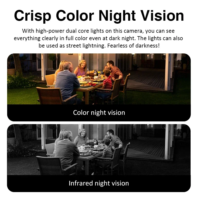 3.การออกแบบแหล่งกำเนิดแสงคู่: มีไฟอินฟราเรดในตัว + ไฟสีขาว สามารถตั้งค่าได้ทั้งโหมดอินฟราเรดสำหรับการมองเห็นในที่มืดและโหมดสีเต็มรูปแบบสำหรับการมองเห็นในเวลากลางคืน