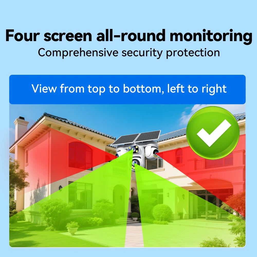 กล้องวงจรปิดพลังงานแสงอาทิตย์ 4G แบบ 4 เลนส์ รุ่น Four Screen: ความละเอียด 20MP AOV พร้อมซูม กล้องรักษาความปลอดภัยภายนอกบ้าน บันทึกวิดีโอ 24/7 ติดตามอัตโนมัติ ตรวจจับความเคลื่อนไหวของมนุษย์