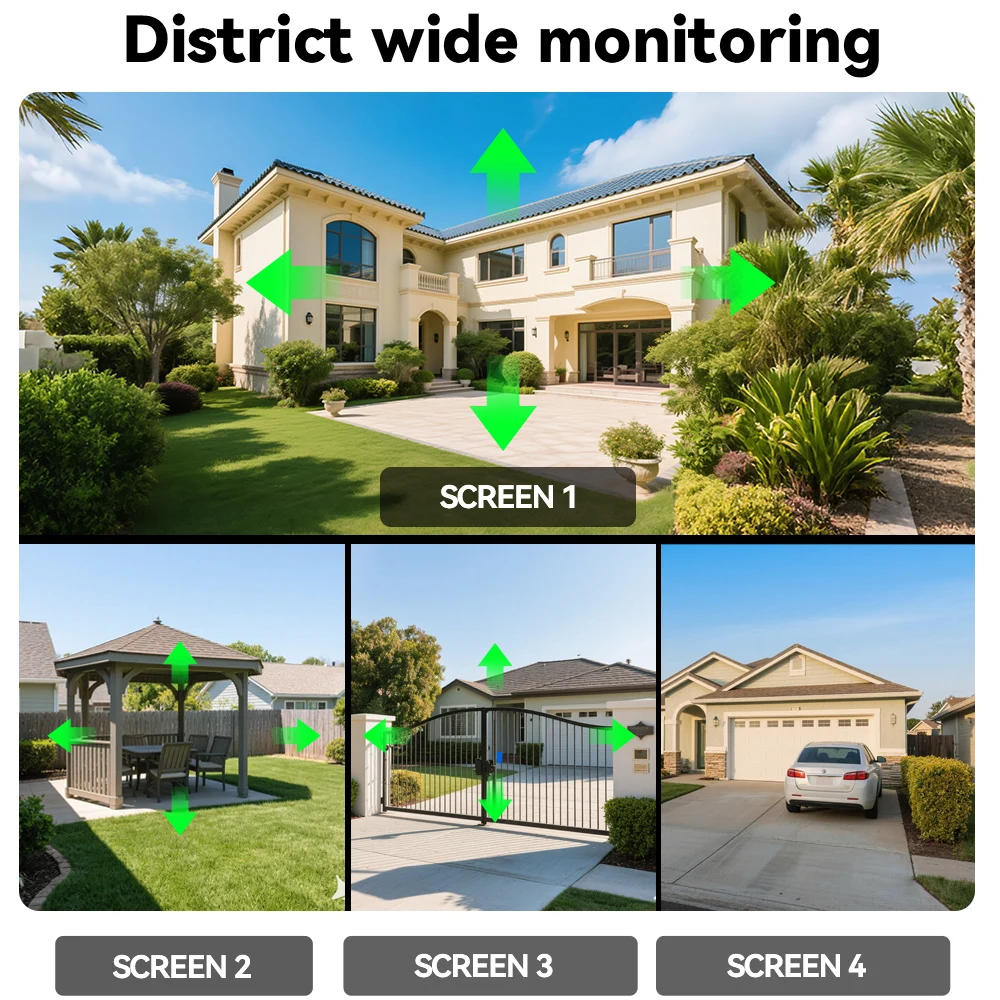 กล้องวงจรปิดพลังงานแสงอาทิตย์ 4G แบบ 4 เลนส์ รุ่น Four Screen: ความละเอียด 20MP AOV พร้อมซูม กล้องรักษาความปลอดภัยภายนอกบ้าน บันทึกวิดีโอ 24/7 ติดตามอัตโนมัติ ตรวจจับความเคลื่อนไหวของมนุษย์