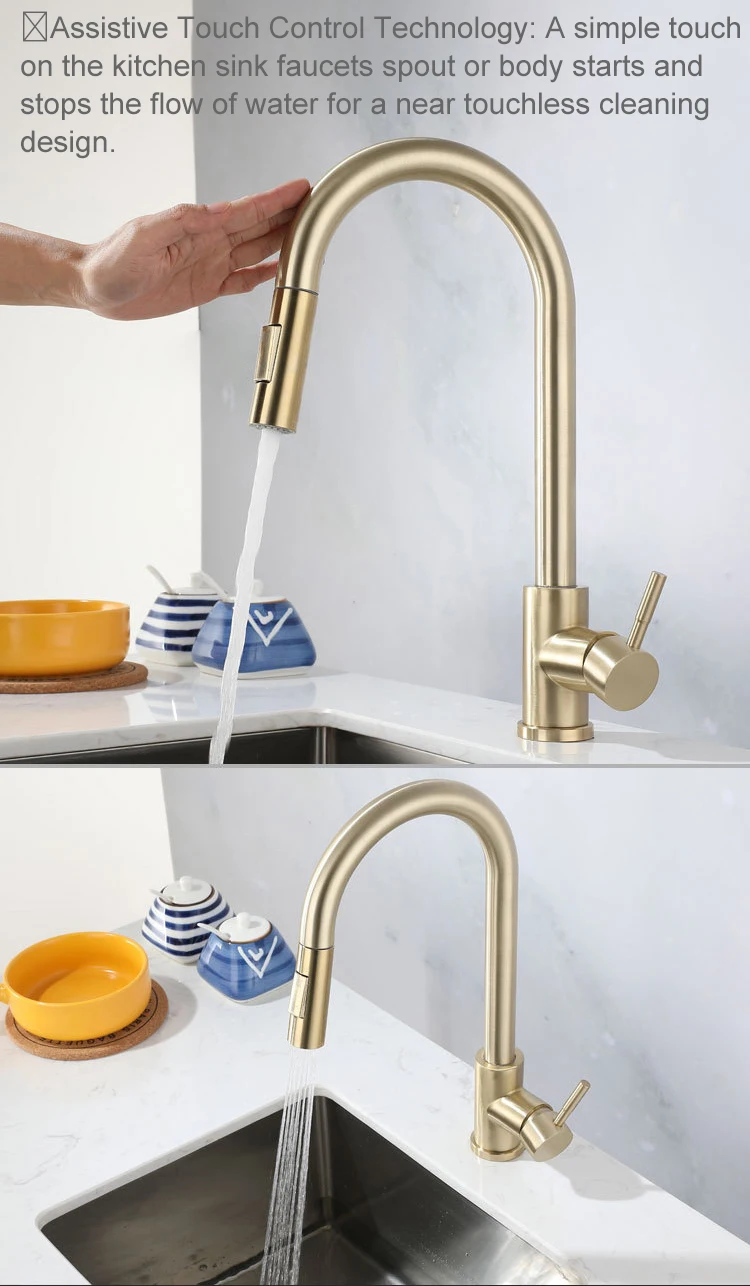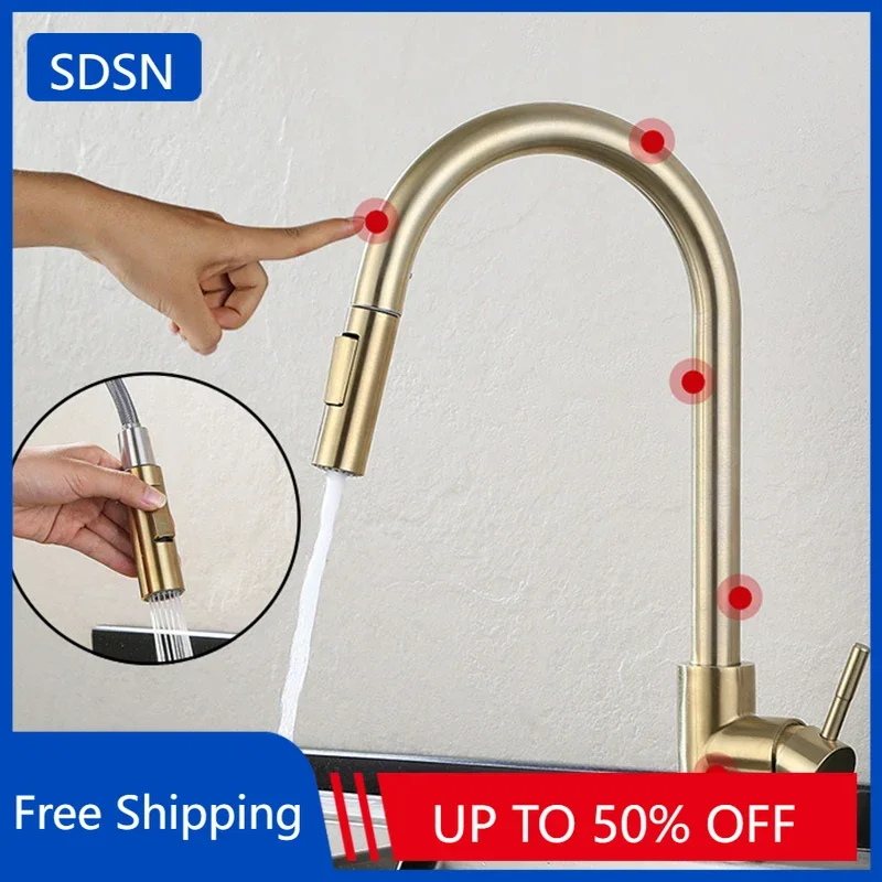 Brushed Gold Touch ก๊อกน้ําห้องครัว 304 สแตนเลสร้อนเย็นดึงออกอ่างล้างจาน Tap สมาร์ท Touch บนก๊อกน้ําห้องครัว