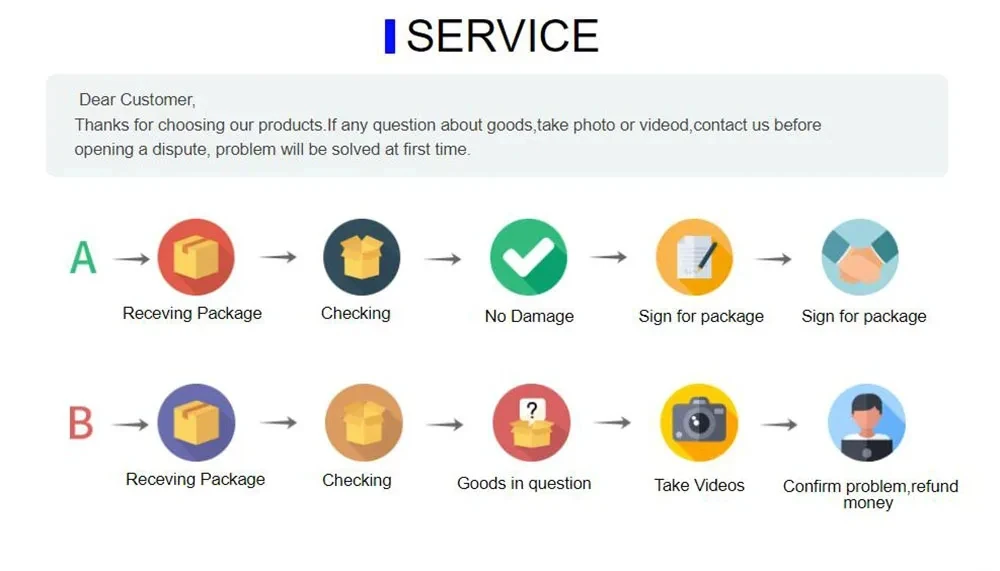 หากคุณได้รับพัสดุที่เสียหาย กรุณาอย่าเปิดข้อพิพาทหรือให้คะแนนรีวิวเชิงลบ โปรดติดต่อเราก่อน เราจะดำเนินการแก้ไขให้คุณ ไม่ต้องกังวล!