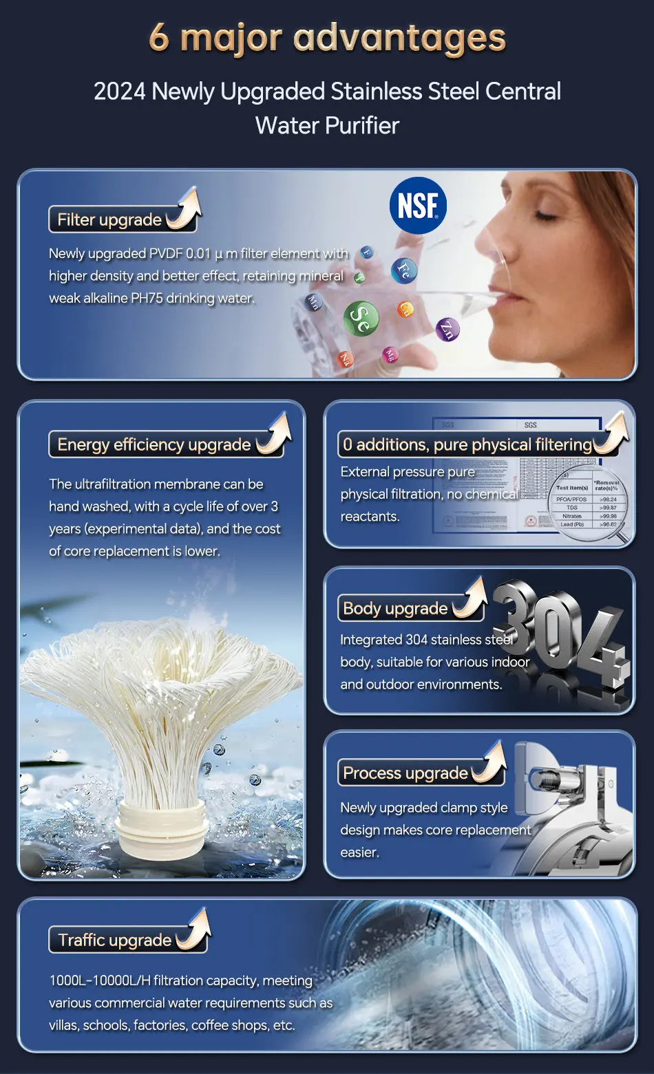 ไส้กรองน้ำสเตนเลส PVDF แบบไหลสูงสำหรับทั้งบ้าน พร้อมระบบล้างย้อนกลับ กรองละเอียดสำหรับแหล่งน้ำต่างๆ 1000L-10000L