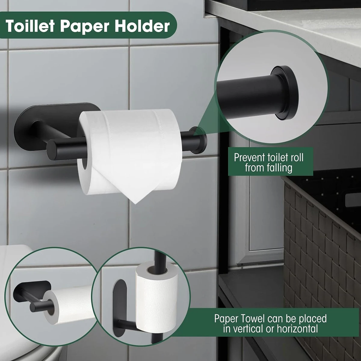 ชุดอุปกรณ์ห้องน้ำ กาวตนเอง สีดำด้าน ชุดอุปกรณ์ห้องน้ำ สแตนเลส ตะขอเสื้อคลุม ที่ใส่กระดาษชำระ ฮาร์ดแวร์