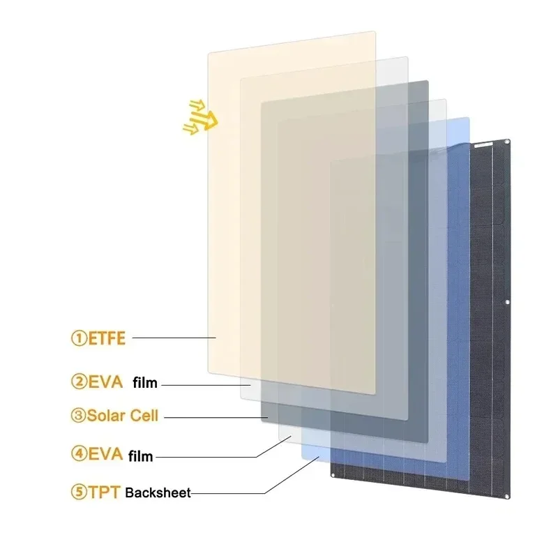 เซลล์แสงอาทิตย์ชนิดโมโนคริสตัลไลน์ที่ใช้มีประสิทธิภาพการแปลงสูง ฟิล์ม ETFE นำเข้า และ EVA ถูกห่อหุ้มด้วยการรับประกัน 25 ปีเพื่อความโปร่งใสสูง