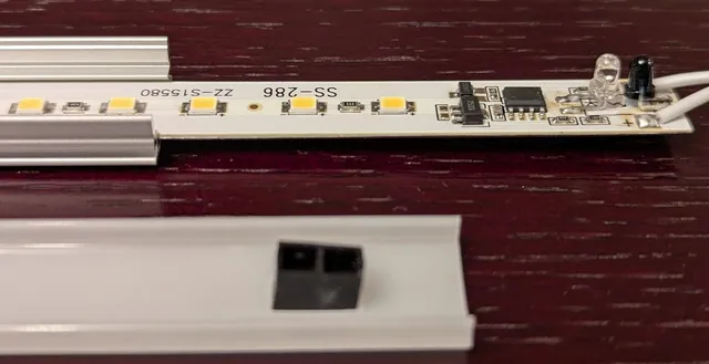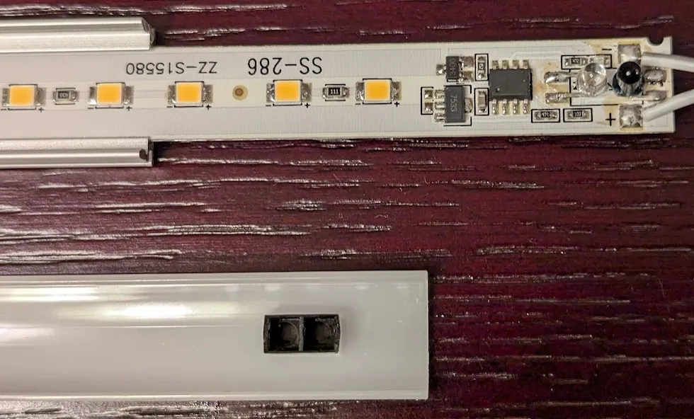 เหมาะสำหรับงาน DIY คุณภาพดี แต่แผ่นวงจรพิมพ์ (PCB) ที่มีแกนโลหะด้านในบางเฉียบจนแทบไม่มีการสัมผัสกับตัวโครงอะลูมิเนียมเลย ดังนั้น ความร้อนจึงเป็นปัญหา ฉันไม่คาดว่ามันจะใช้งานได้นานหากใช้ไฟ 12V (เต็ม 5W) ลดลงเหลือ 9 หรือ 10V แทบจะเย็นเมื่อใช้ไฟ 9V (~2W, 200mA) อุ่นที่ 10V (~300mA) การจัดเรียง LED ที่ค่อนข้างแปลก: ส่วนใหญ่เป็น 3 ตัวต่อแบบอนุกรมกับตัวต้านทาน 43 โอห์ม แต่กลุ่มสุดท้ายเป็น 2 ตัวต่อแบบอนุกรมกับตัวต้านทาน 110 โอห์ม สวิตช์โบกมือทำงานได้ดีในระยะใกล้ อีกสิ่งหนึ่งที่แปลกคือแจ็คไฟขนาด 5.5 x 2.5 มม. ควรเป็น 2.1 มม.